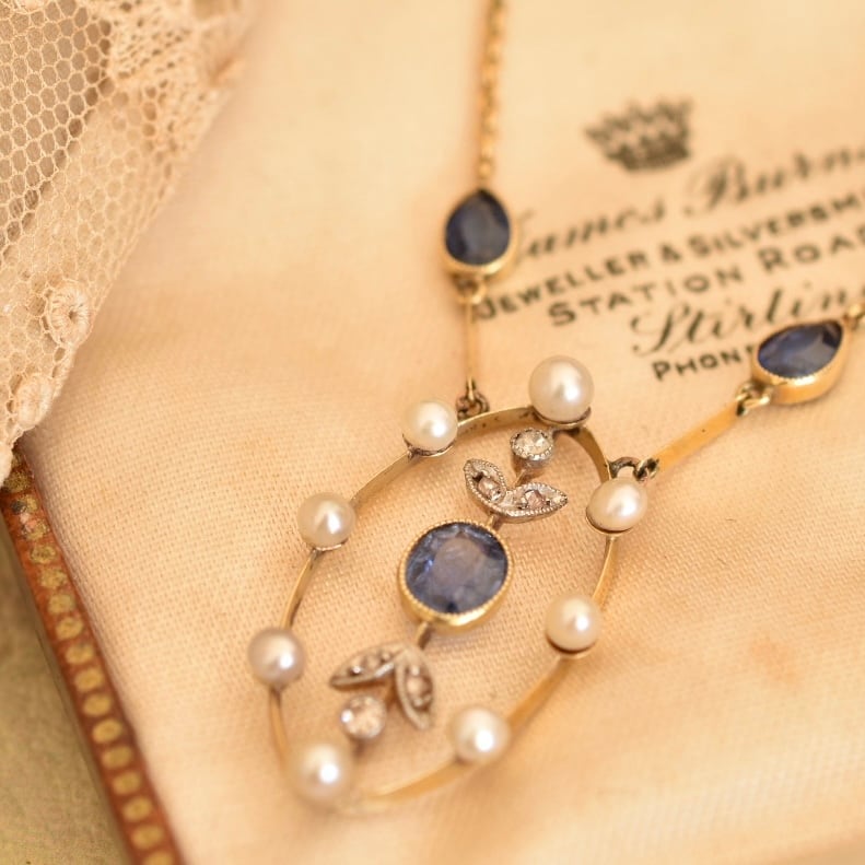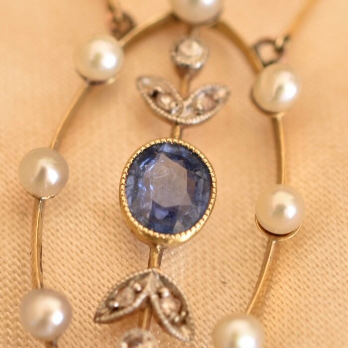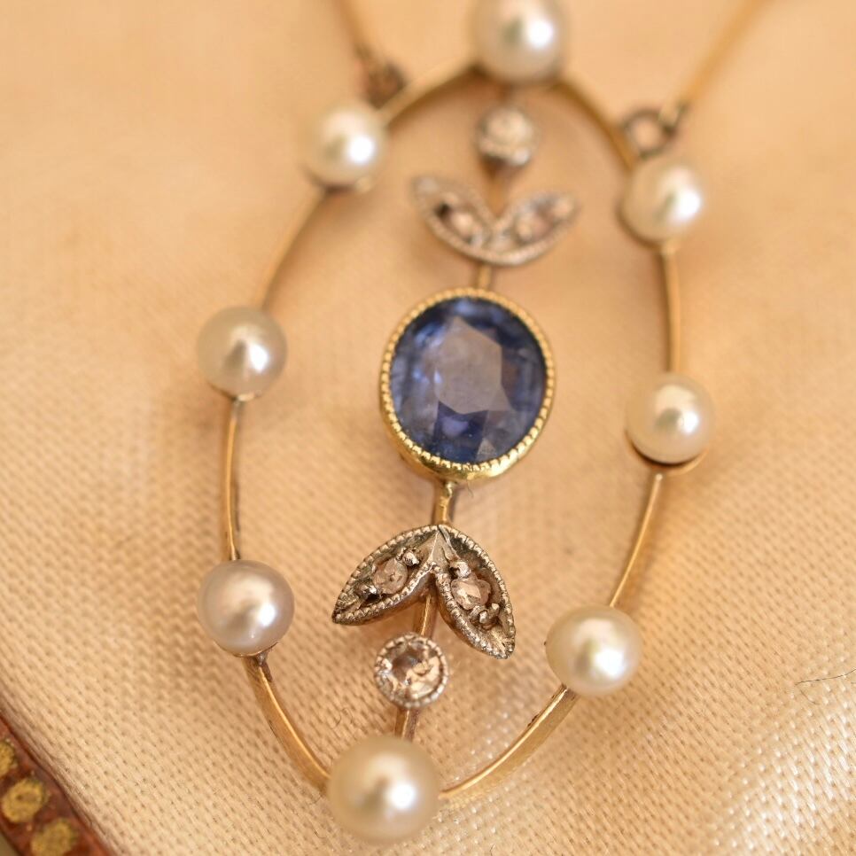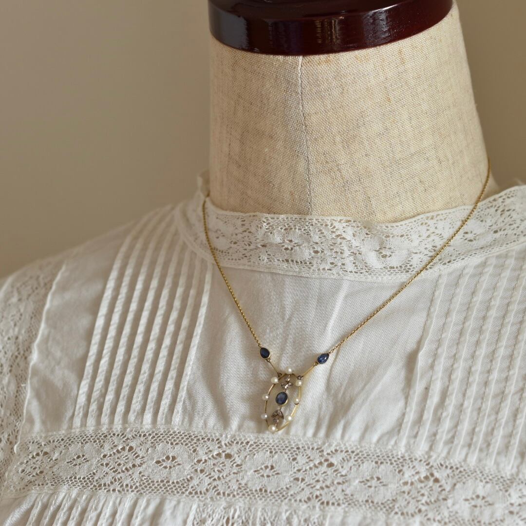 英国アンティーク 1890年ヴィクトリア朝時代 K15 サファイア、ダイヤモンド、シードパールのネックレス ソーティングメモ付、刻印あり