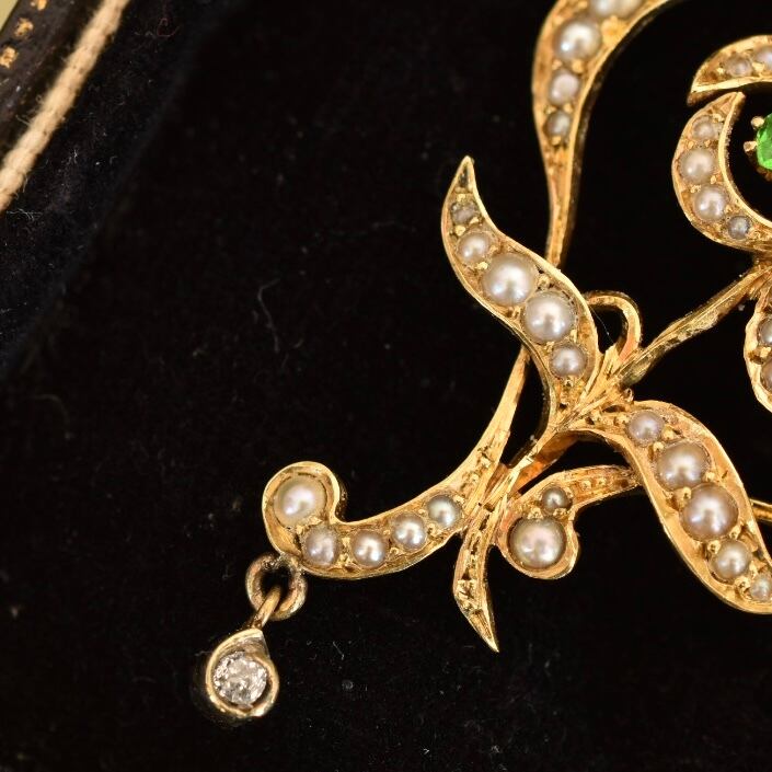 鮮やかなグリーンの天然グロッシュラライトガーネットと天然シードパールで彩られた一輪のお花。