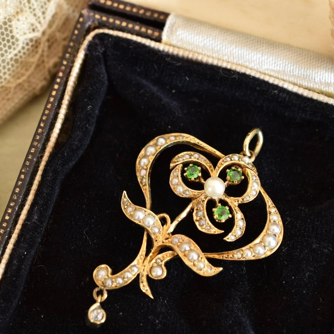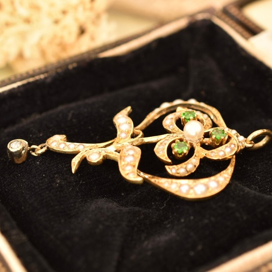 英国アンティーク 1890年ヴィクトリアン K14 天然グロッシュラライトガーネットと天然ダイヤモンドのペンダントトップ
