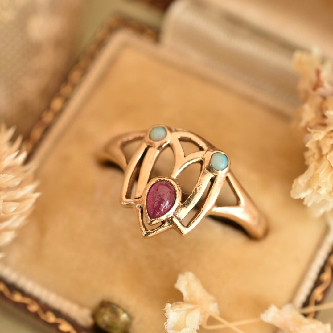 英国アンティーク 1900年 アールヌーヴォー K9 天然ルビーと天然オパールの指輪 ソーティングメモ付 刻印あり