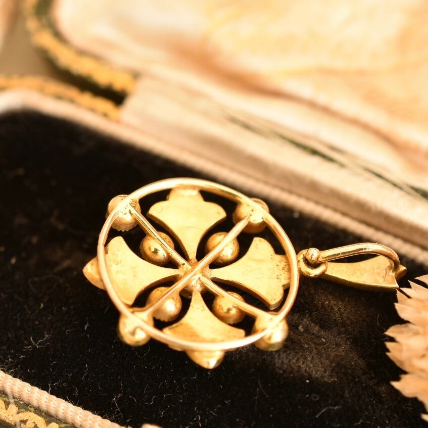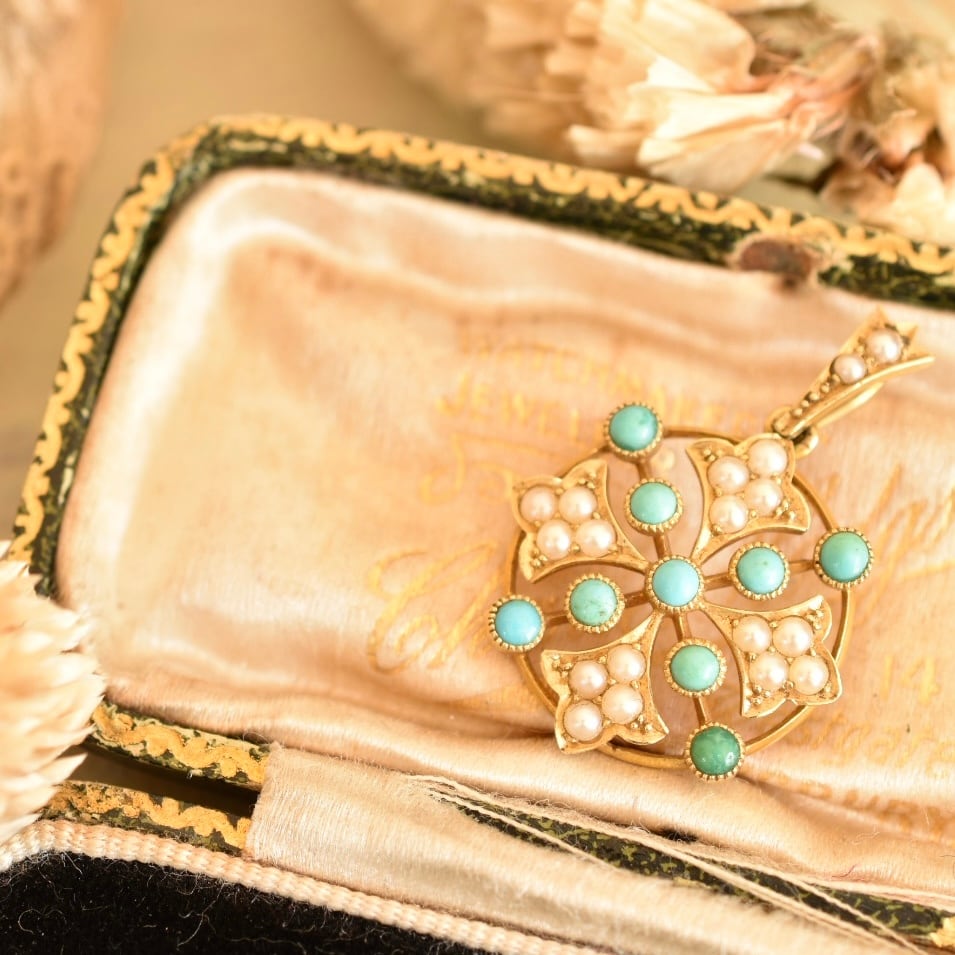 英国アンティーク 1890年ヴィクトリアン K15 天然シードパールと天然ターコイズのペンダントトップ ソーティングメモ付