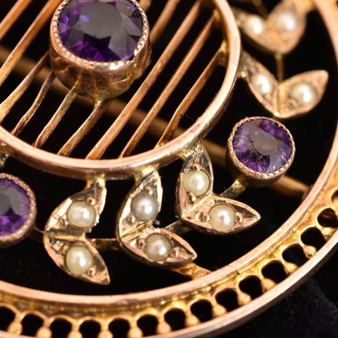 英国アンティーク ヴィクトリアン K14 天然アメジストと天然シードパールのガーランドのペンダントブローチ ソーティングメモ付 刻印あり