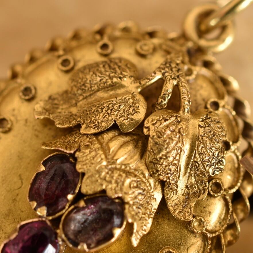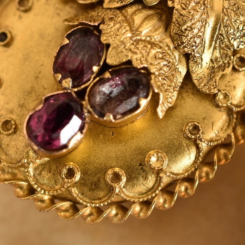 英国アンティーク19世紀 ヴィクトリアン K15 天然ガーネット、天然トパーズとガラス 葡萄ブローチ