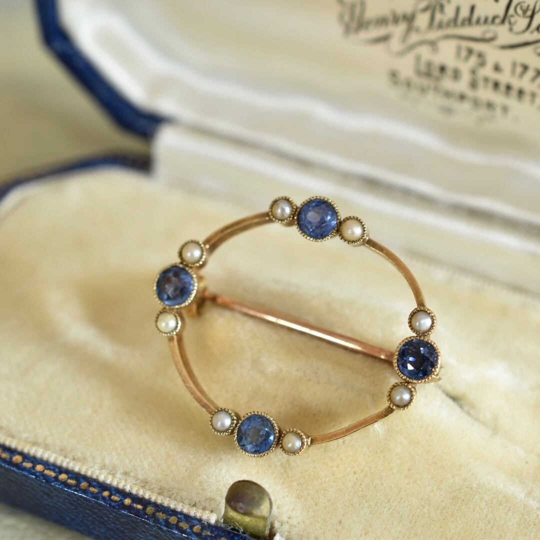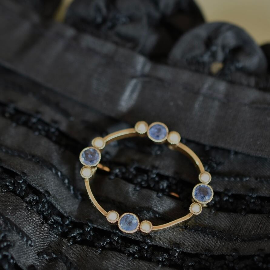 英国アンティーク 1880年ヴィクトリアン K15 天然サファイアとシードパールのサークルブローチ