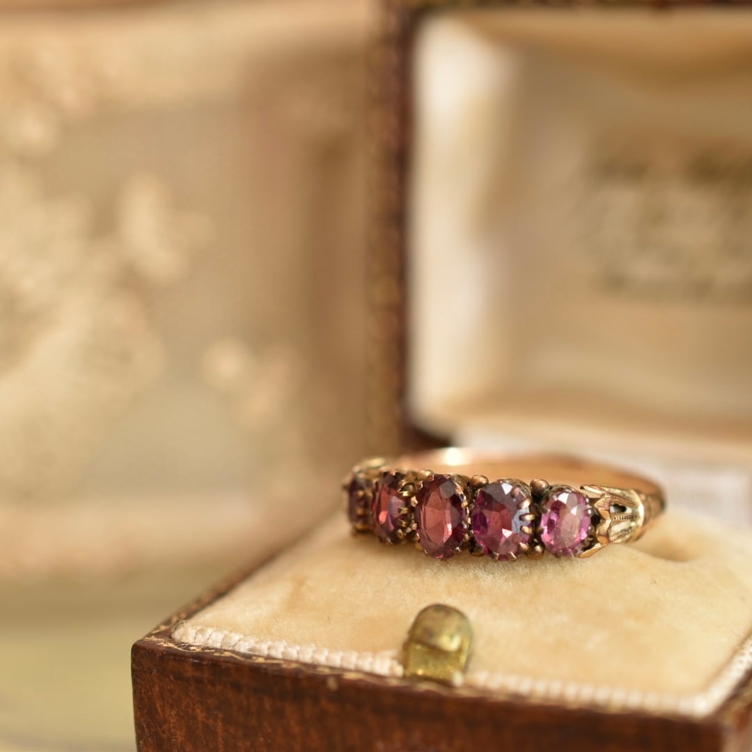 ワインレッドの魅惑な輝きに惹き込まれる天然ロードライトガーネットが中央にかけて大きくなるように5石並んだリングになります。