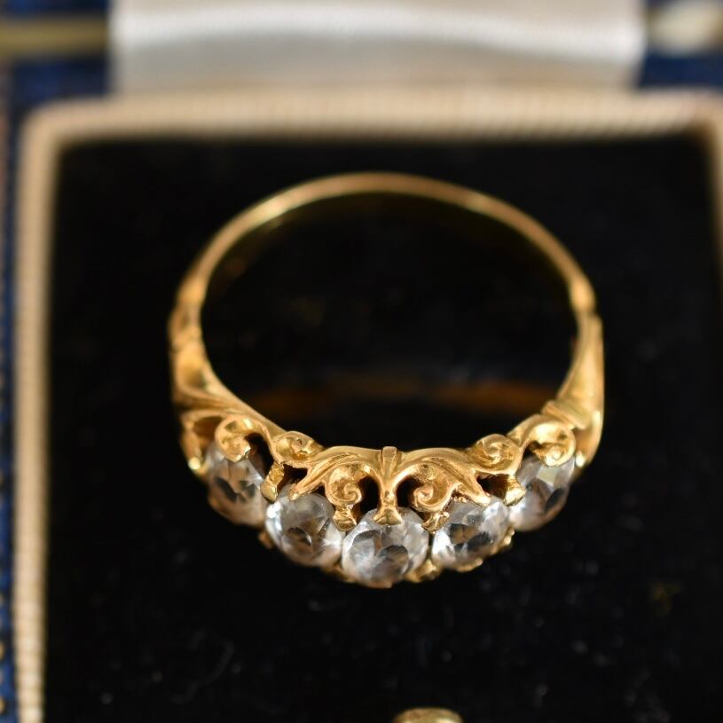 5石の無色透明の天然クォーツが、経年による味わい深い色味の18金のオリジナルシャンクに配されています。