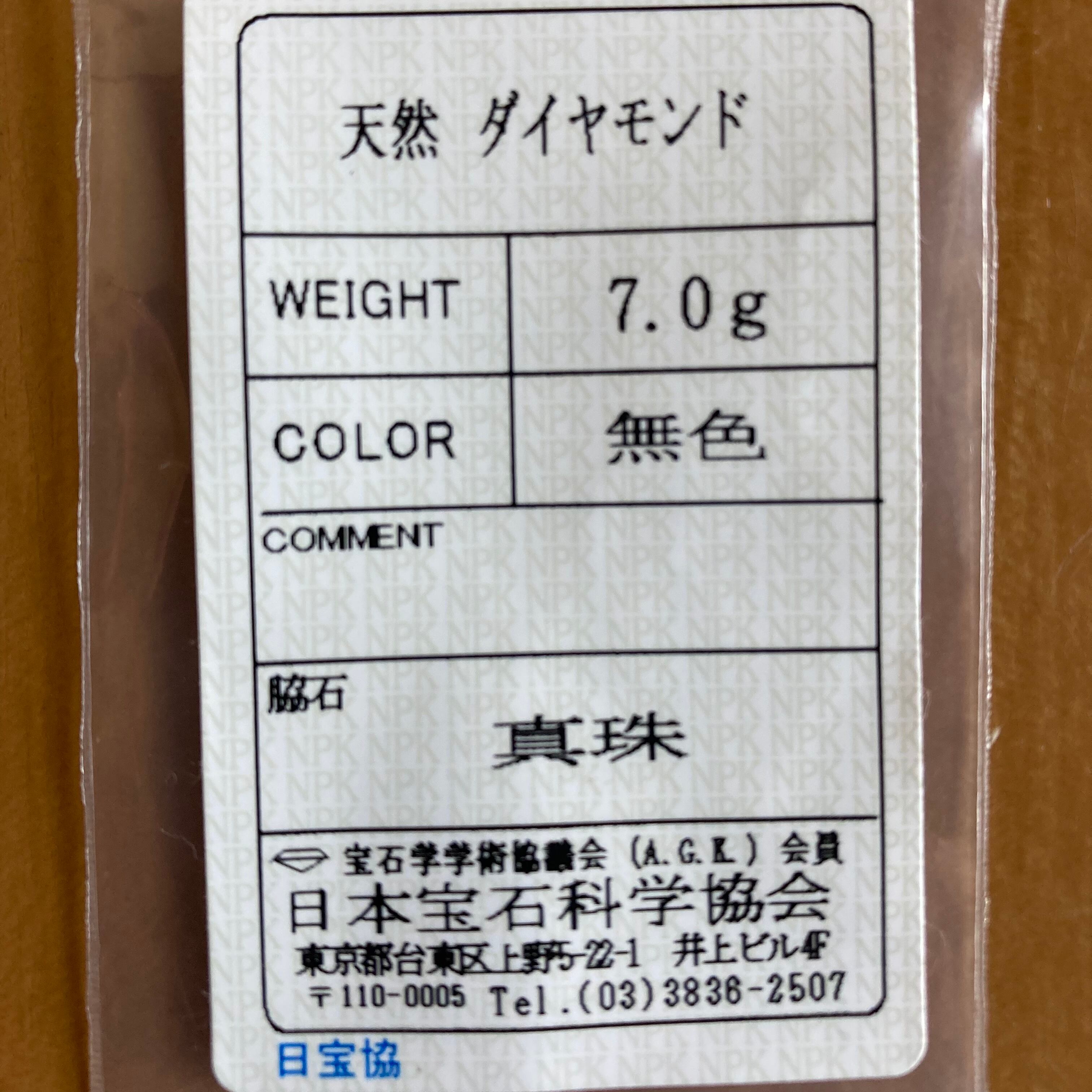 天然ダイヤモンドと天然シードパールにつきましては、専門機関にて鑑別済みです。