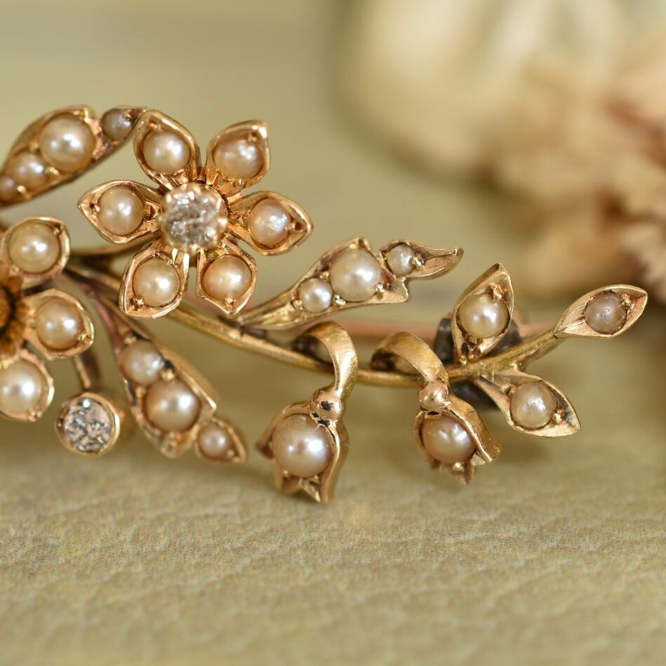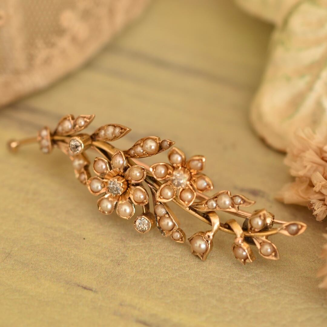 英国アンティーク 1880年 ヴィクトリアン K18 天然ダイヤと天然パールの花束ブローチ