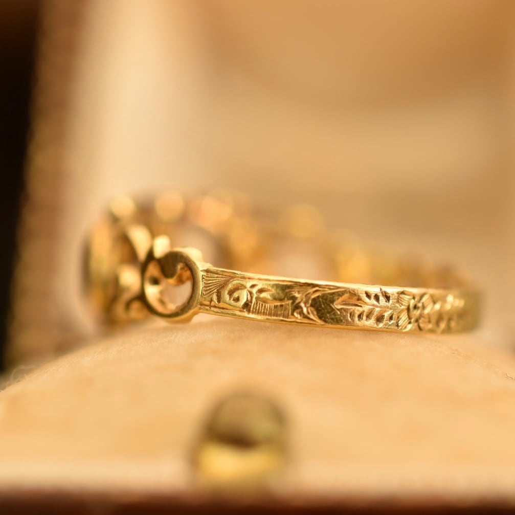 オリジナルシャンクには、熟練の職人の手彫りによる植物模様の彫金が全面余すところなく施されており、アンティークならではのクラシカルなデザインです。