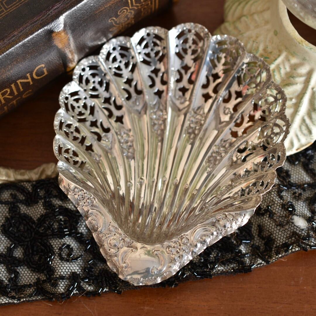 手作業による凝った透かし細工やお花模様の彫刻が素敵なこちらのシェル型トレイは、英国1896年ヴィクトリアン期のAtkin Brothers製のものになります。