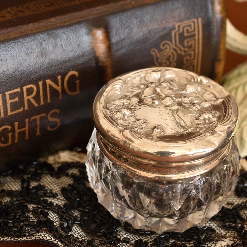 20世紀初頭頃、クレマチスのお花のエンボス模様が可愛いスターリングシルバーとガラスの容器になります。