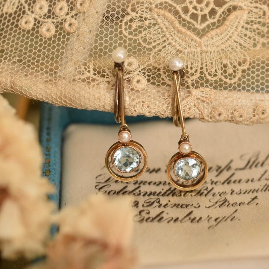 英国アンティーク 1880年 ヴィクトリアン 15金 天然アクアマリンと天然シードパールのイヤリング
