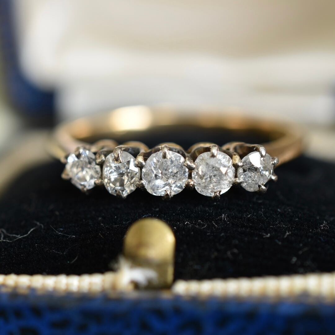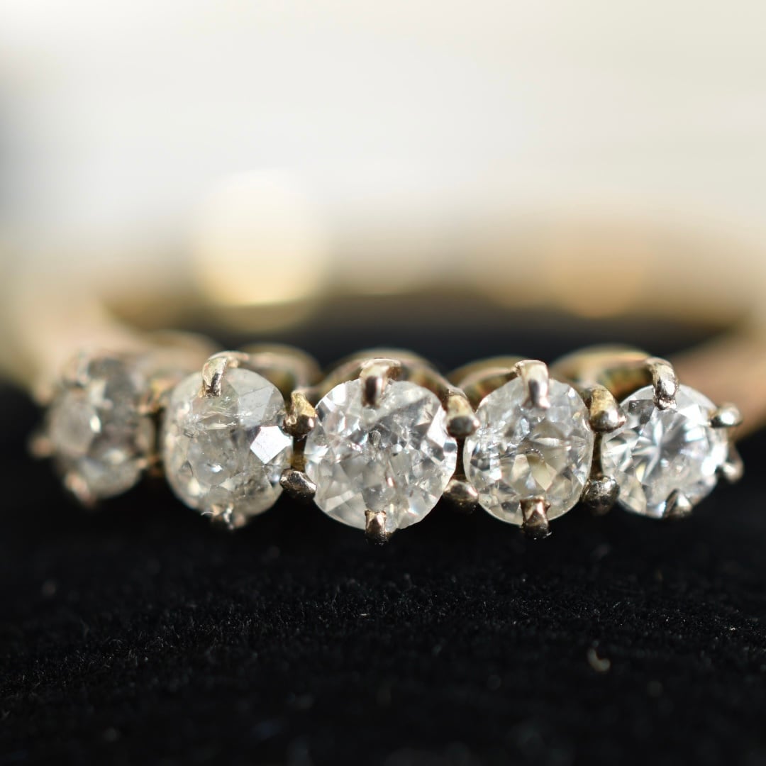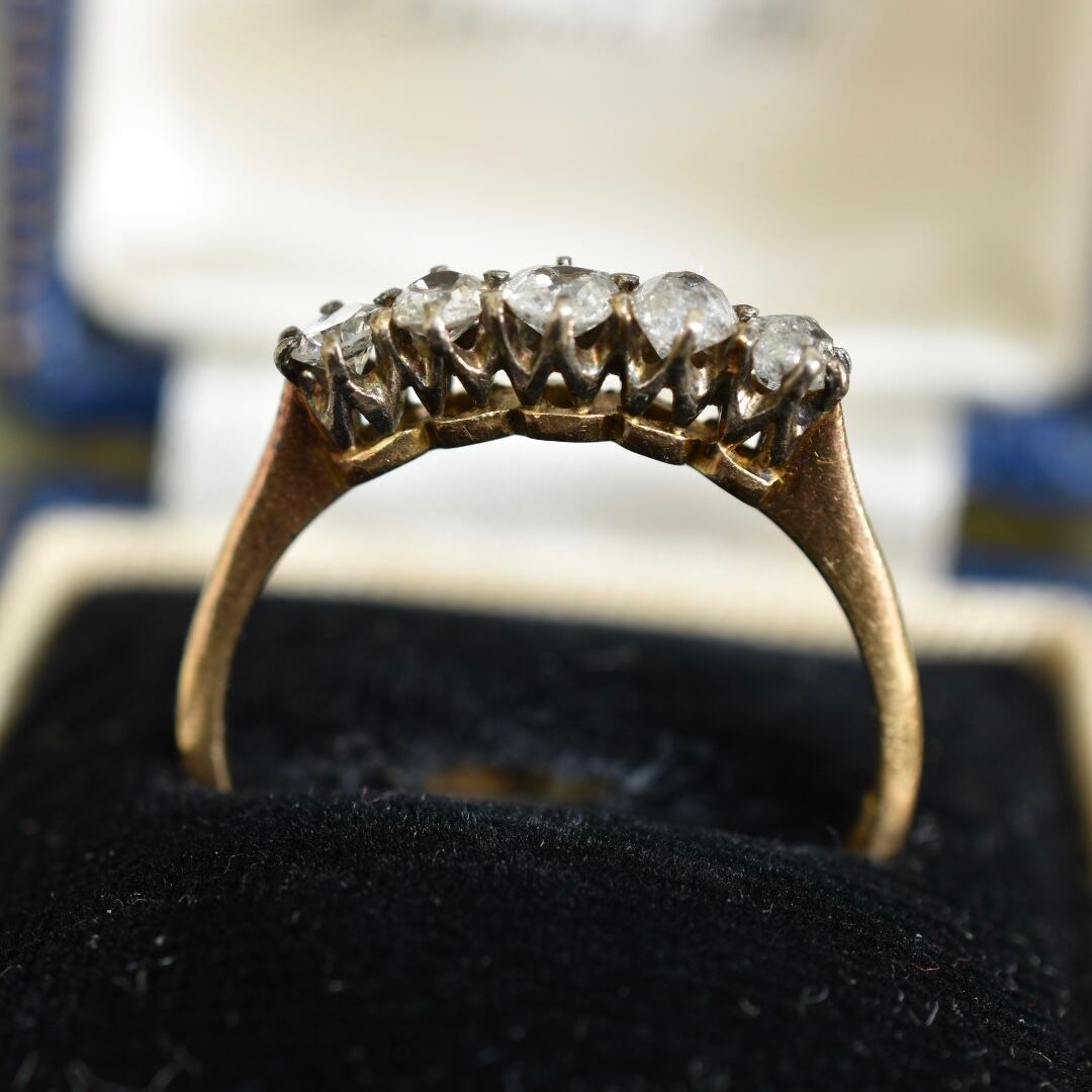 中央にかけて大きくなるようにダイヤモンドが5石、18金のオリジナルシャンクに配された現代でも人気のデザイン、ファイブストーンリング。