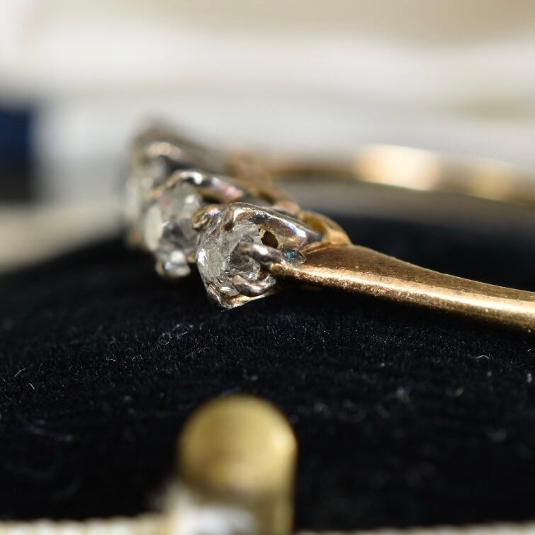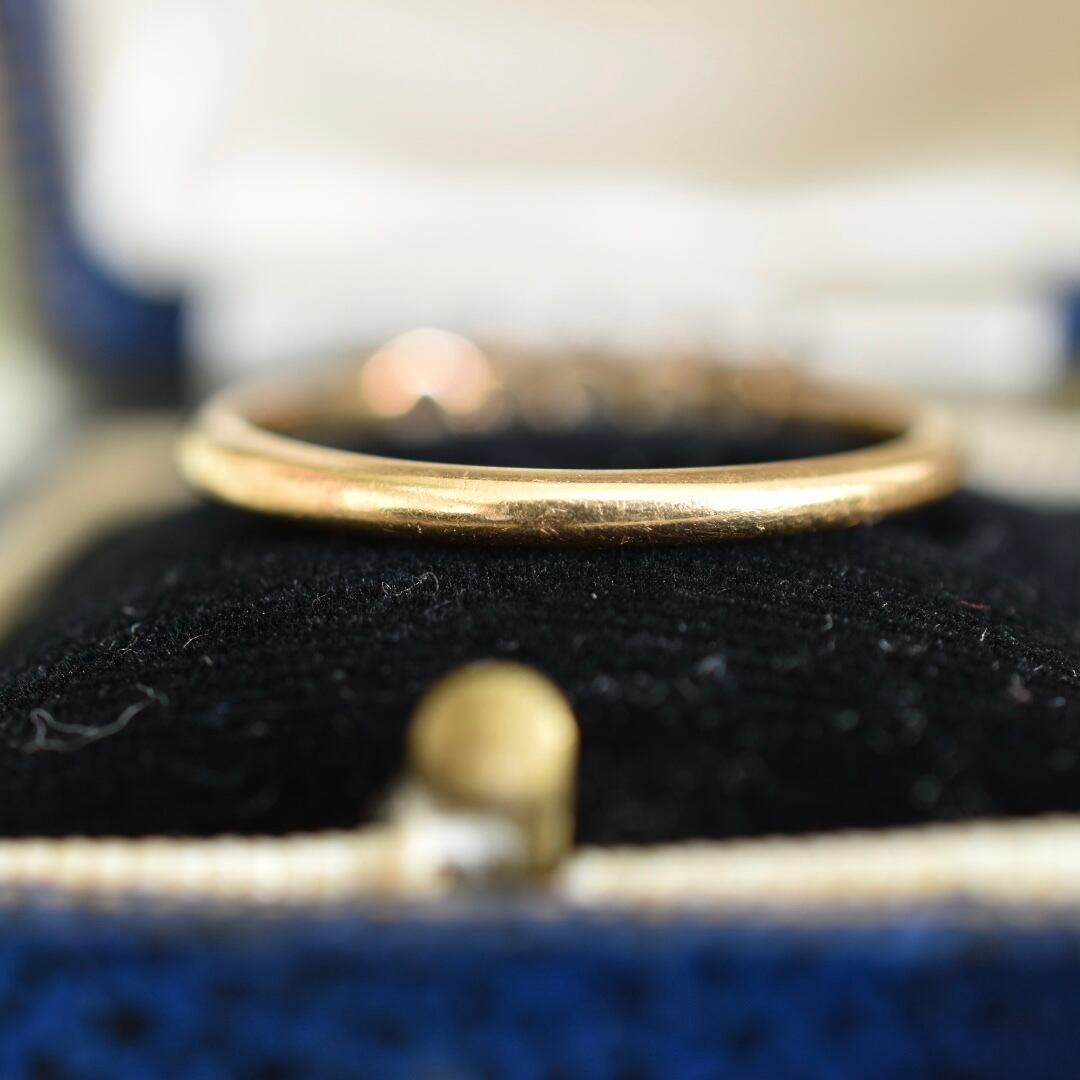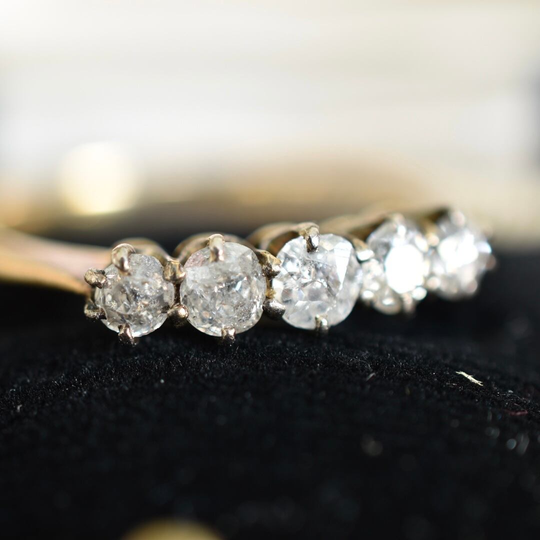 中央にかけて大きくなるようにダイヤモンドが5石、18金のオリジナルシャンクに配された現代でも人気のデザイン、ファイブストーンリング。