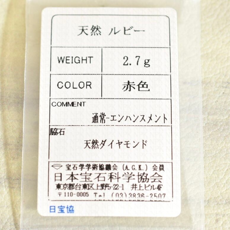 天然ルビー、天然ダイヤモンドにつきましては、専門機関にて鑑別済みです。