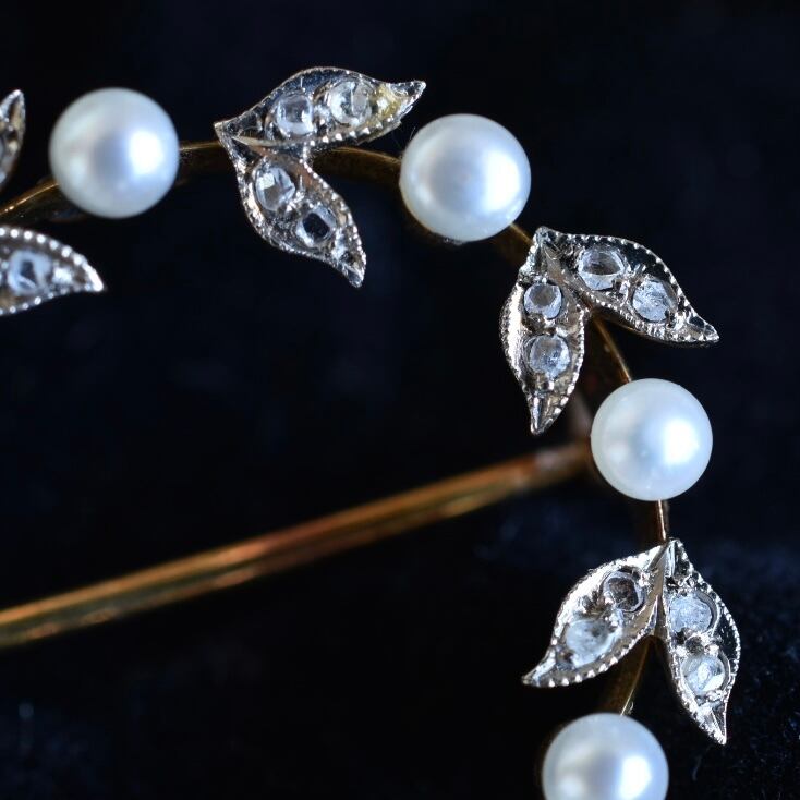 ローズカットの天然ダイヤモンドが嵌め込まれた月桂樹の葉とパールが交互に配されたリースのサークルブローチ。