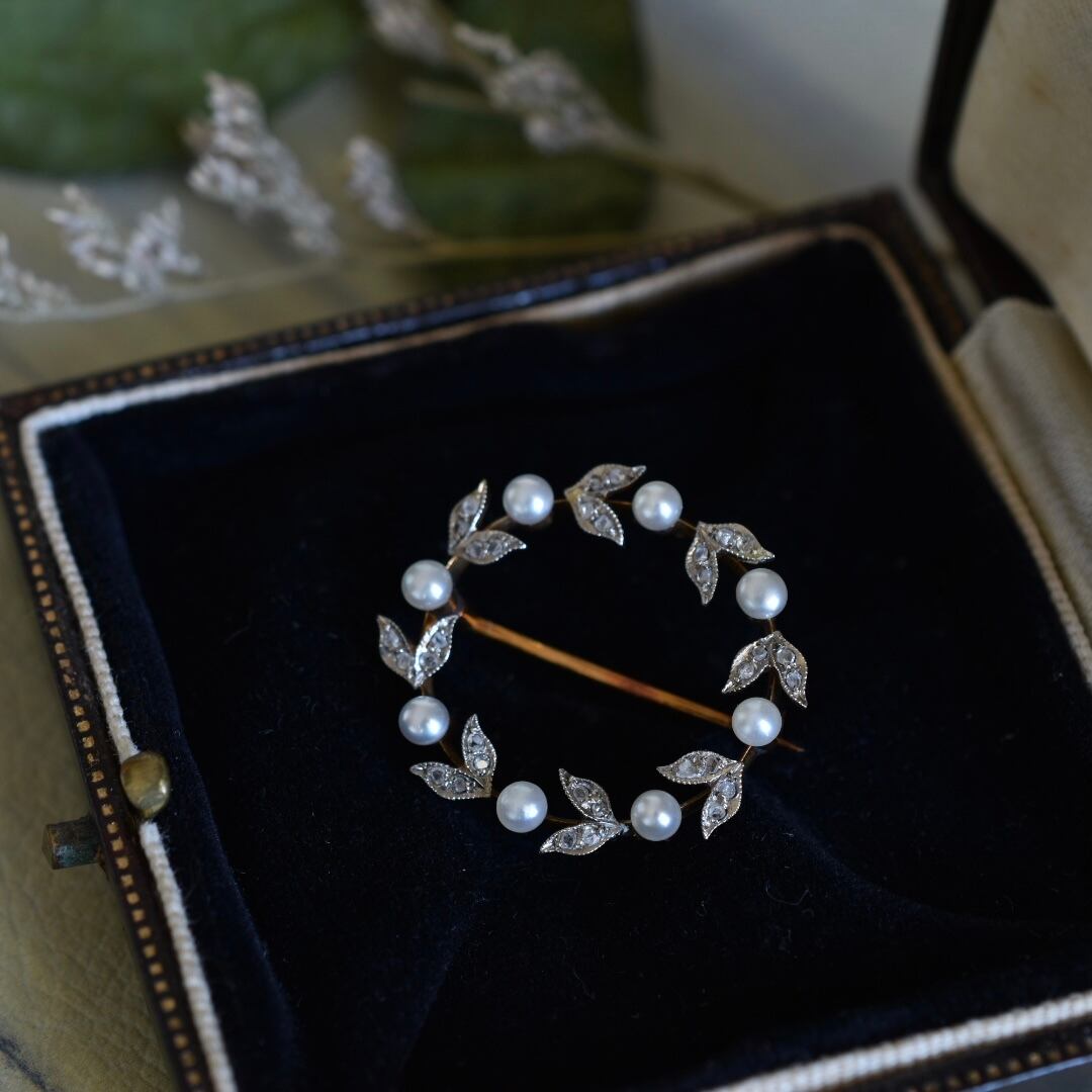 英国アンティーク 20世紀初頭 エドワーディアン期 18金&プラチナ 天然ダイヤモンド&天然パール 月桂樹のリースブローチ a