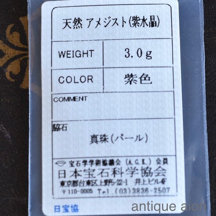 天然アメジストと天然シードパールにつきましては、専門機関にて鑑別済みです。