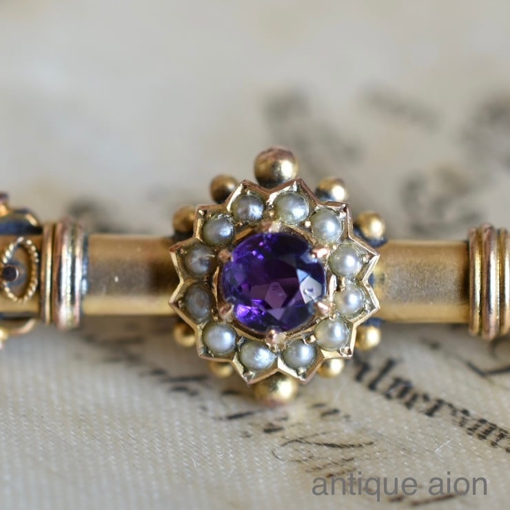 英国アンティーク 1898年 ヴィクトリアン期 9金 天然アメジストと天然シードパールのブローチ