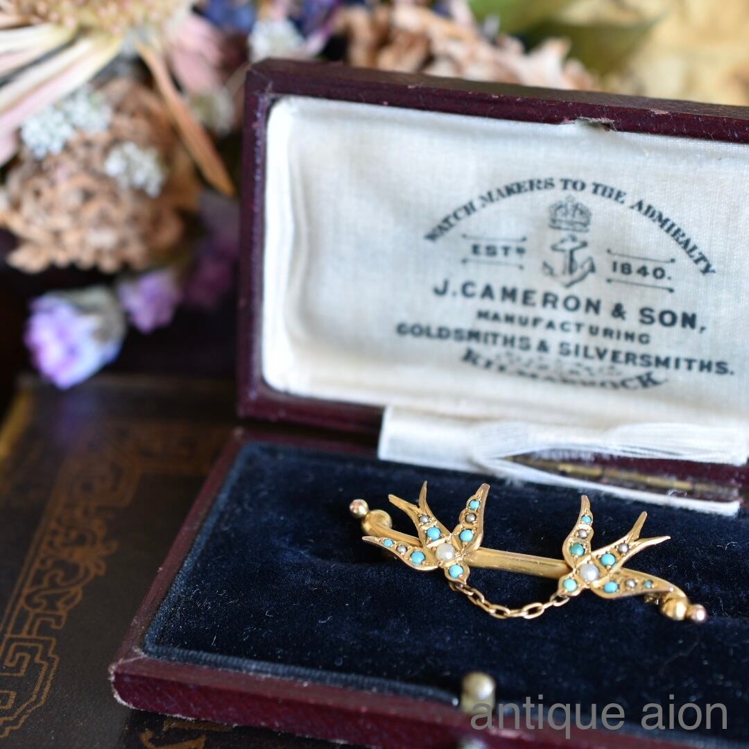 英国アンティーク 1900年 チェスター製 9金 天然ターコイズ&天然シードパール ツバメのブローチ