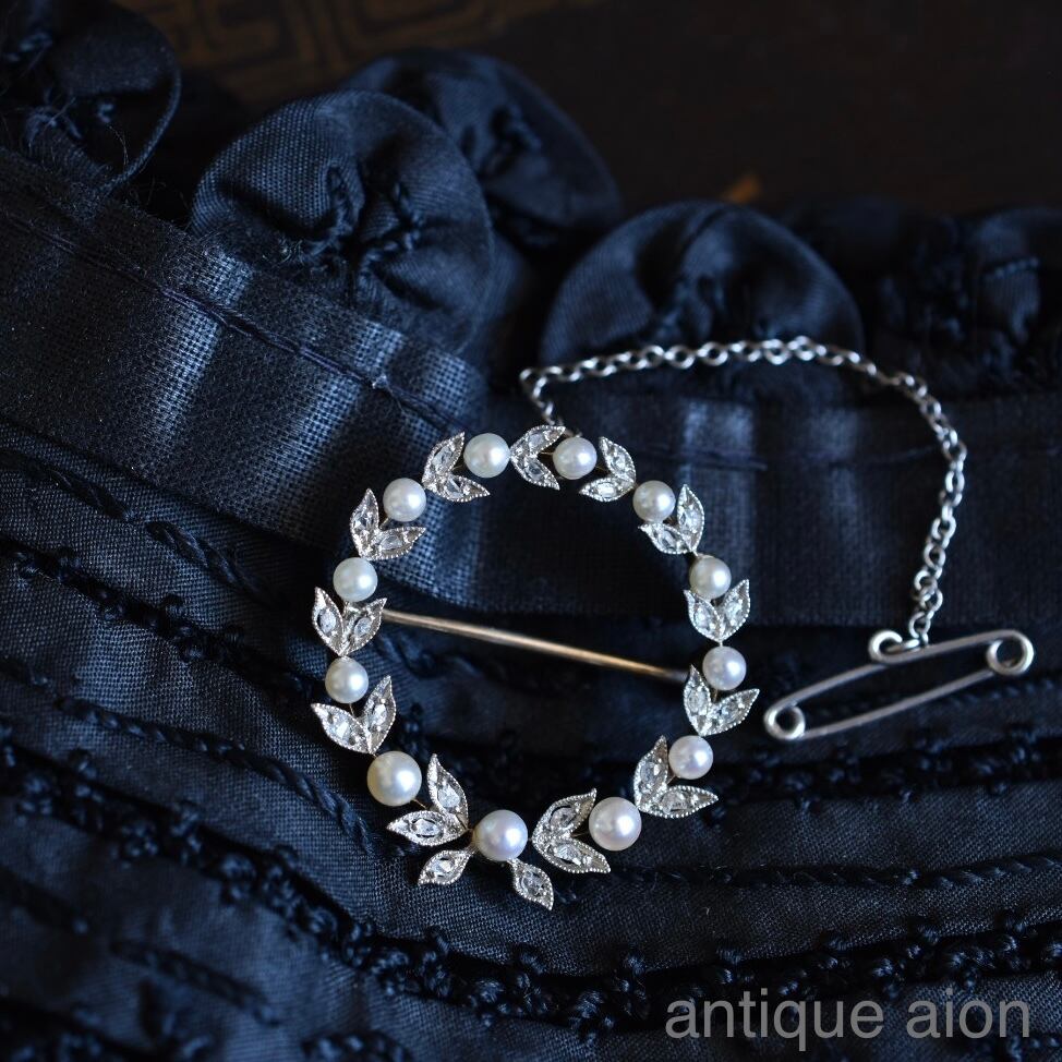 英国アンティーク 20世紀初頭 エドワーディアン期 18金&プラチナ 天然ダイヤモンド&天然パール 月桂樹のリースブローチ b