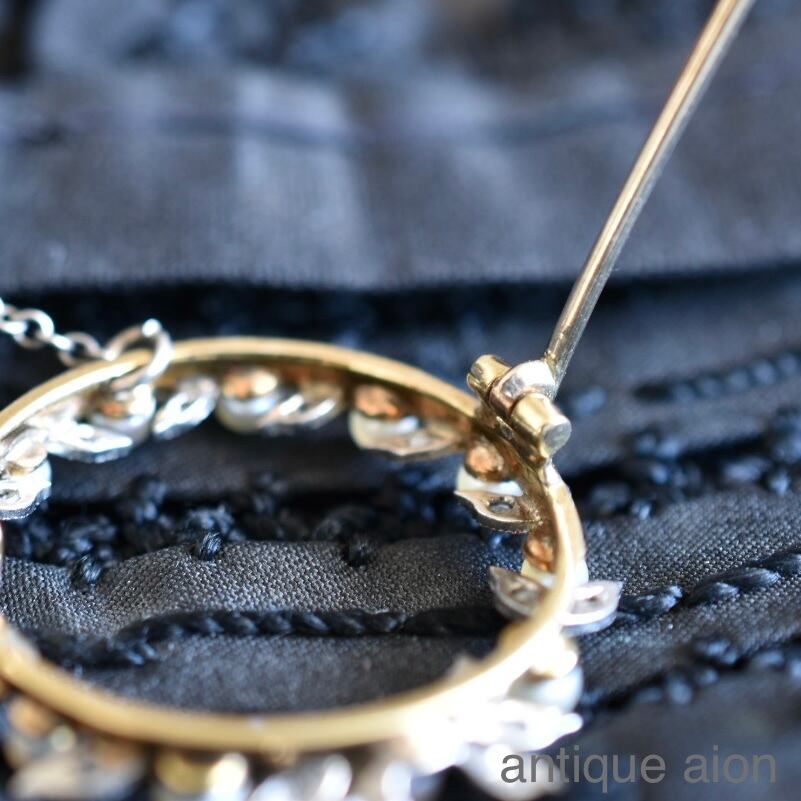 ローズカットの天然ダイヤモンドが嵌め込まれた月桂樹の葉とパールが交互に配されたリースのサークルブローチ。