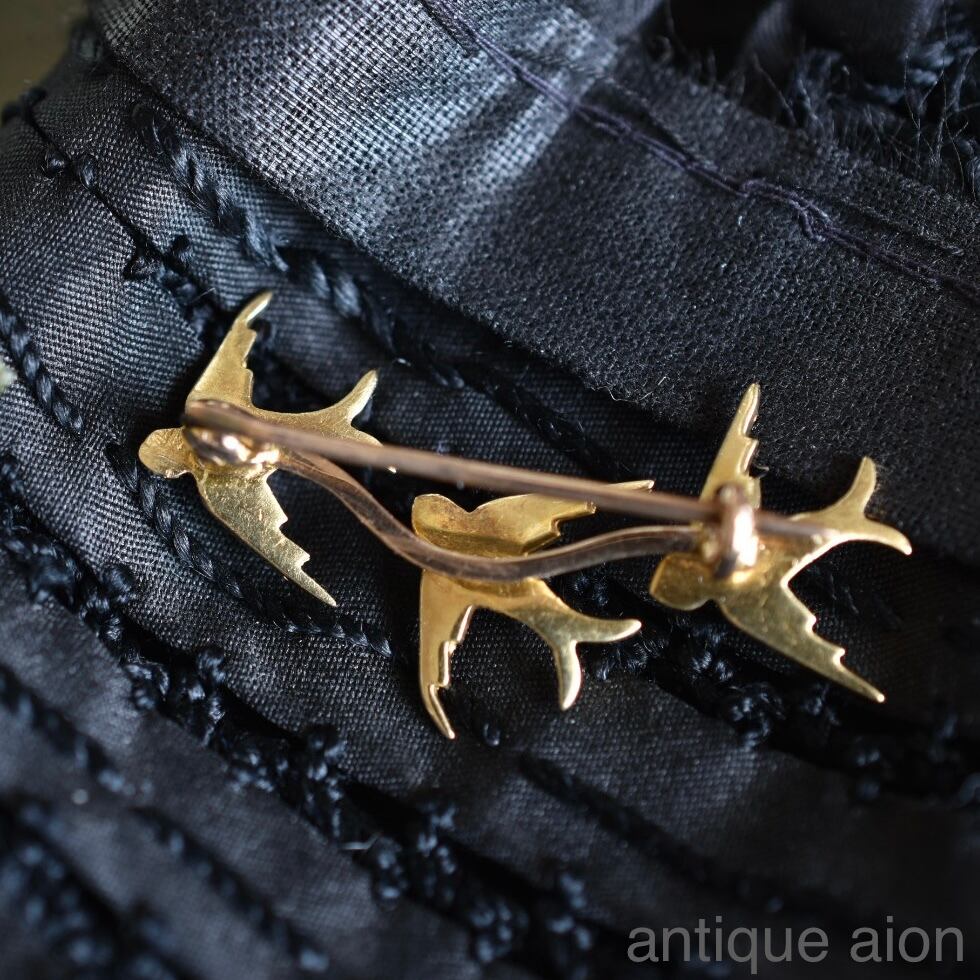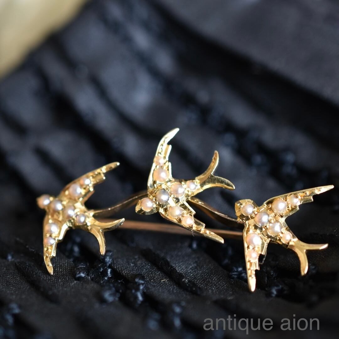 英国アンティーク 1880年 15金 天然シードパール 3羽のツバメブローチ
