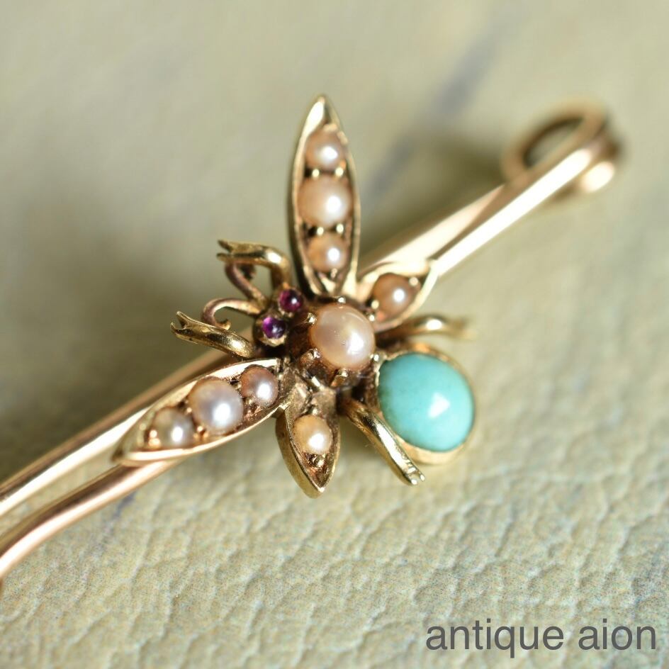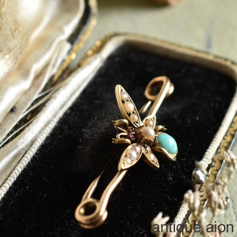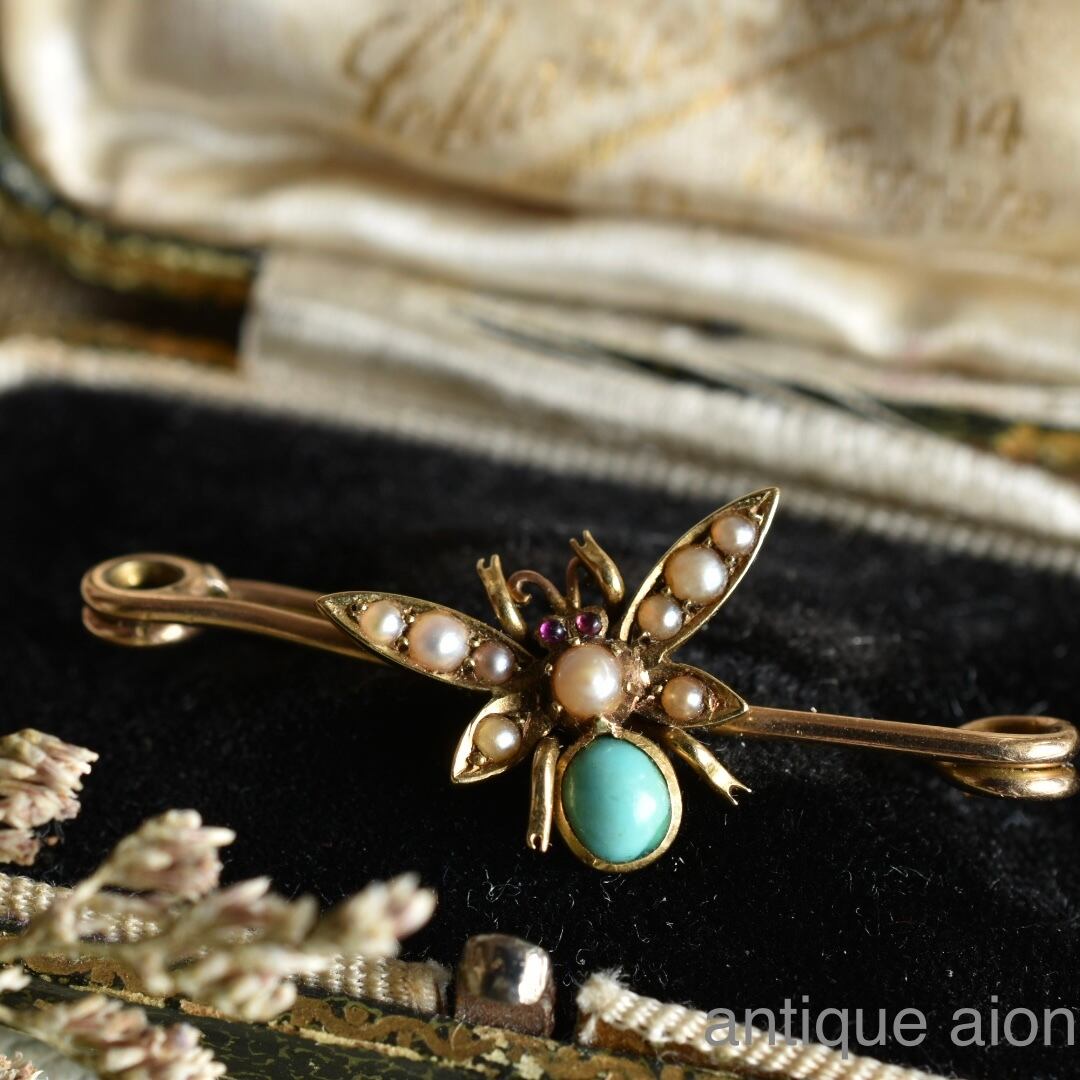 英国アンティーク 1900年代 9金 天然ルビー、ターコイズ、シードパール 昆虫のブローチ