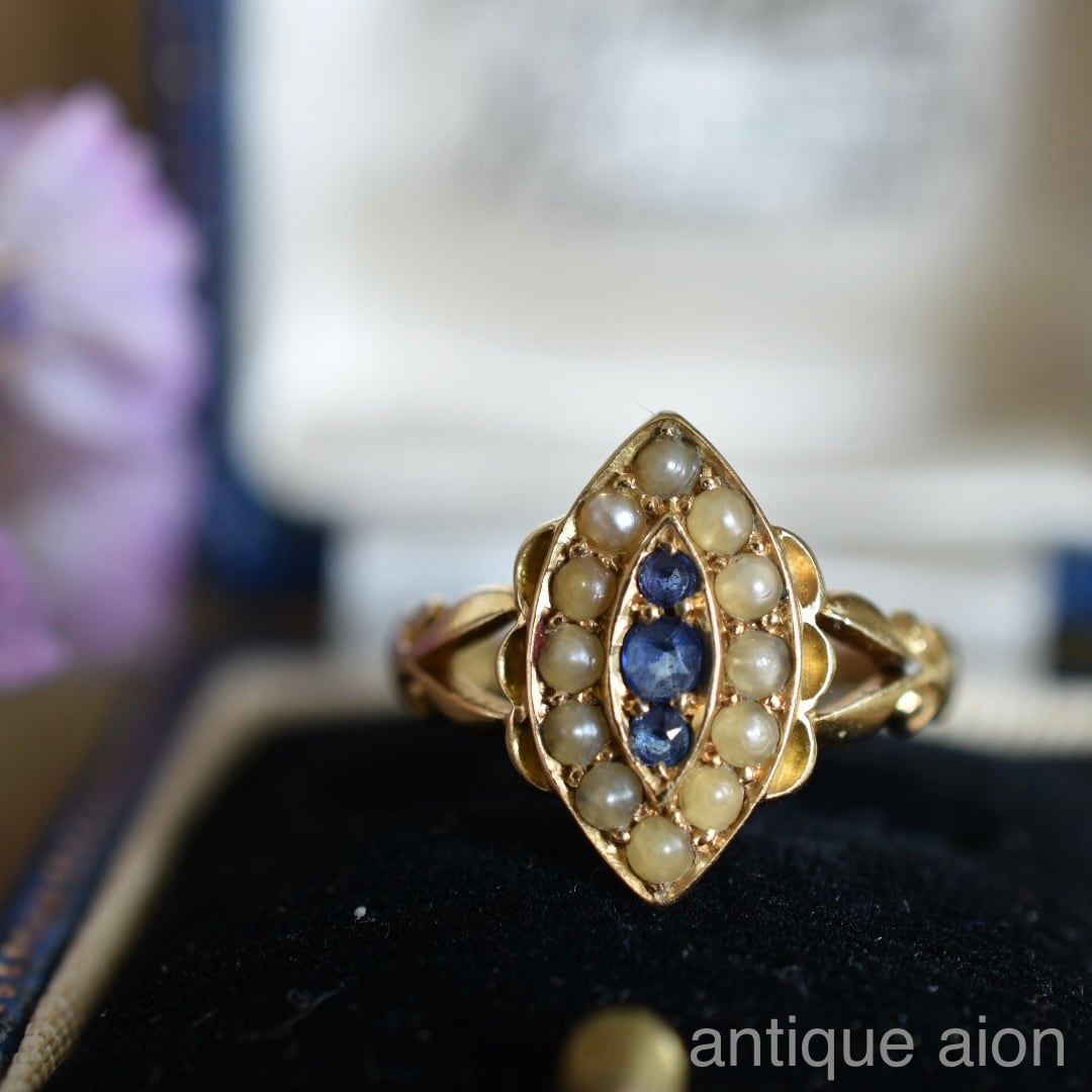 英国アンティーク 1900年 ヴィクトリア朝時代 18金 天然サファイアと天然シードパールのマーキーズリング