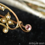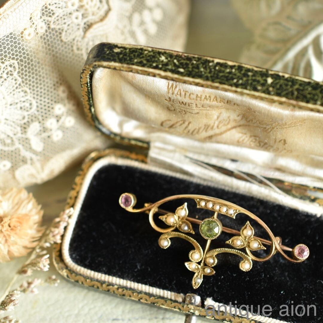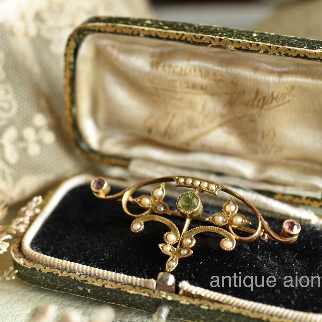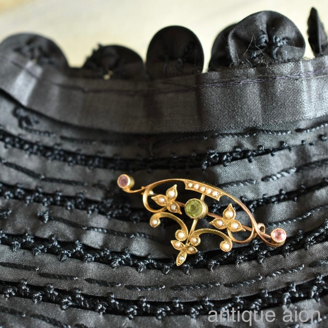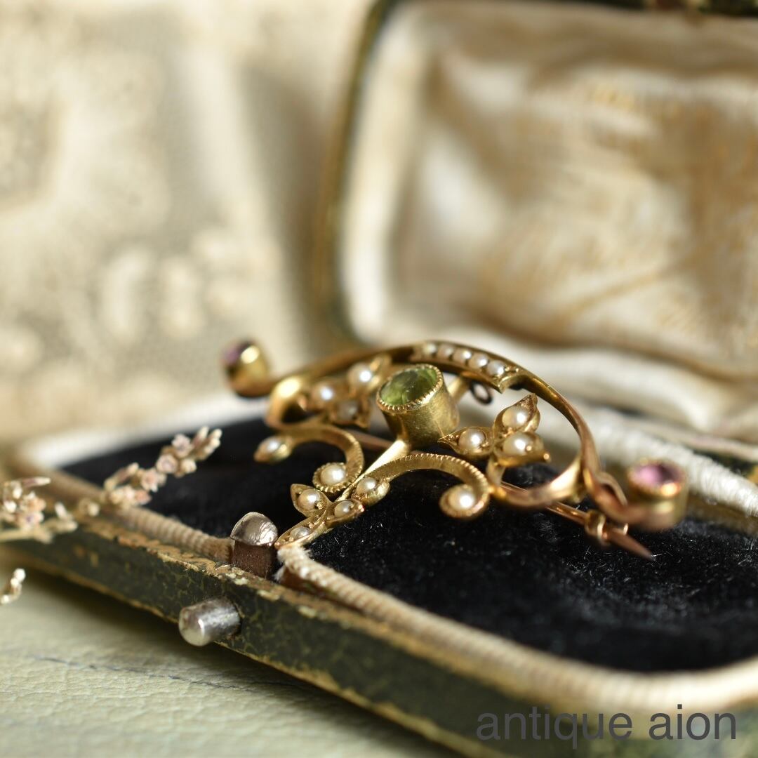 英国アンティーク 1900年 アールヌーボー K15 天然トルマリン,ペリドットとシードパールのブローチ