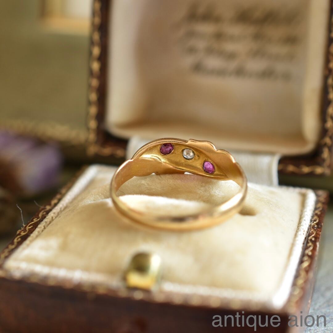英国アンティーク 1900年 ヴィクトリアン 18金 天然ルビーと天然ダイヤモンドのジプシーリング