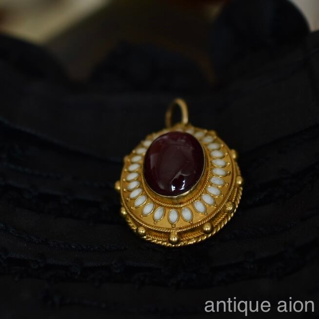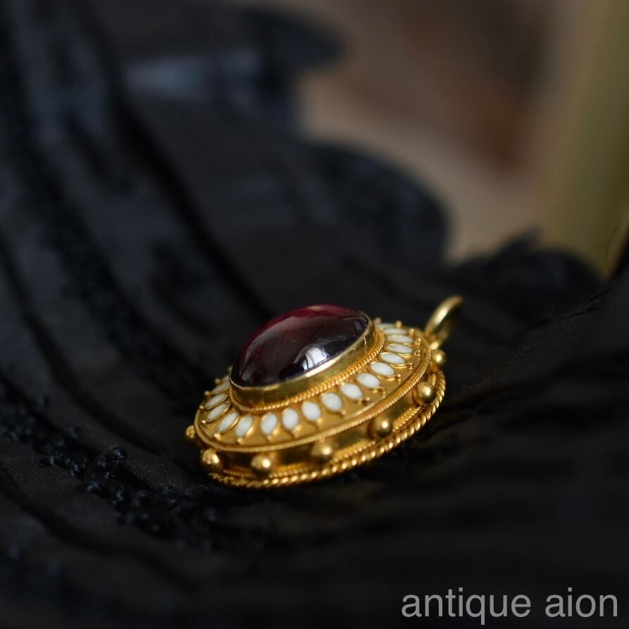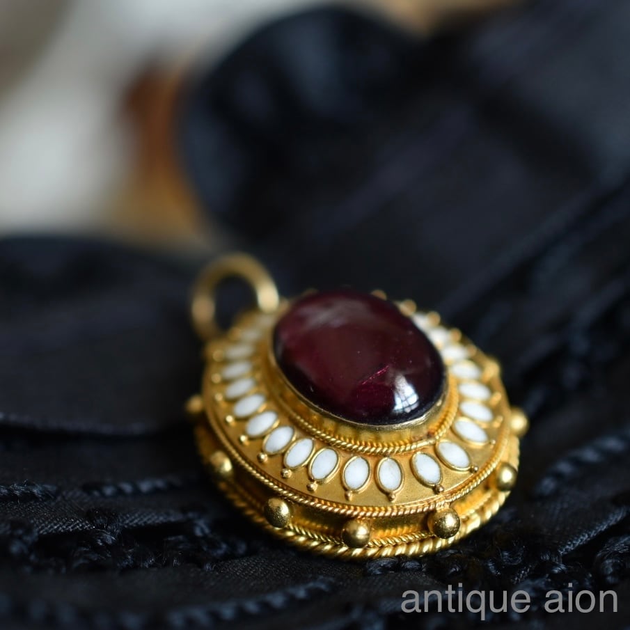 ガーネットの周りを飾る雫の型をした金枠の中にはホワイトエナメルが施されており、ガーネットの神秘的な輝きをより一層引き立たせています。