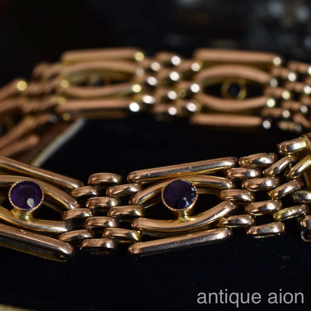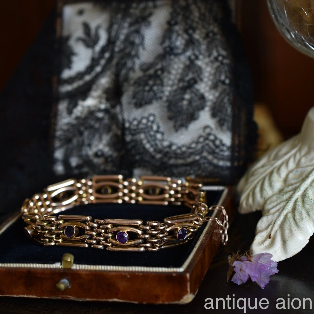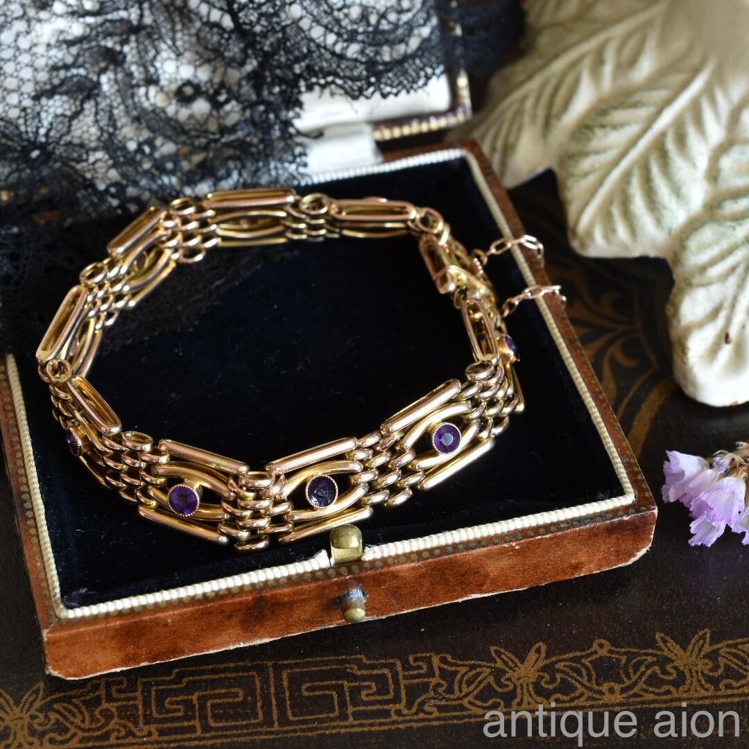 英国アンティーク 20世紀初頭 エドワーディアン 9金ローズゴールド 天然アメジストのゲートリンクブレスレット