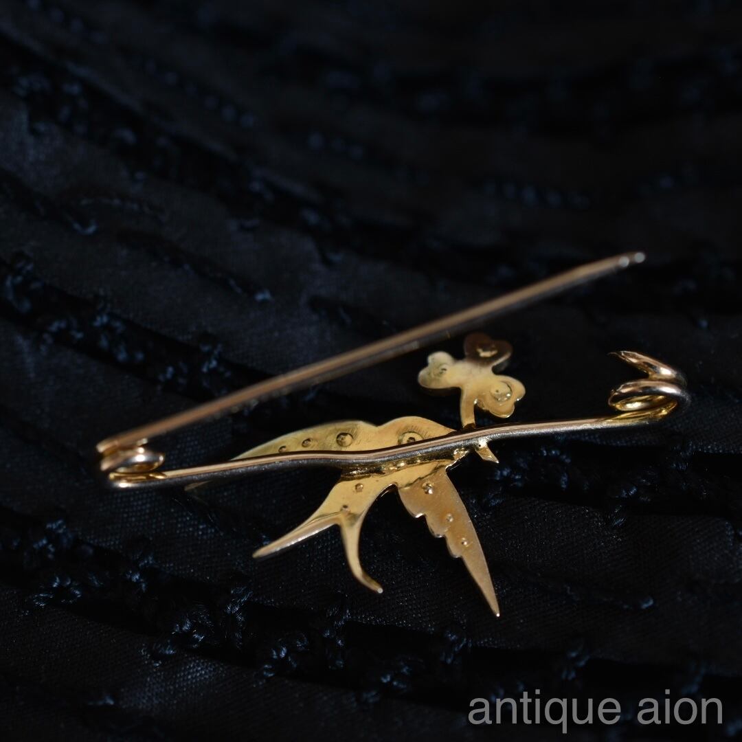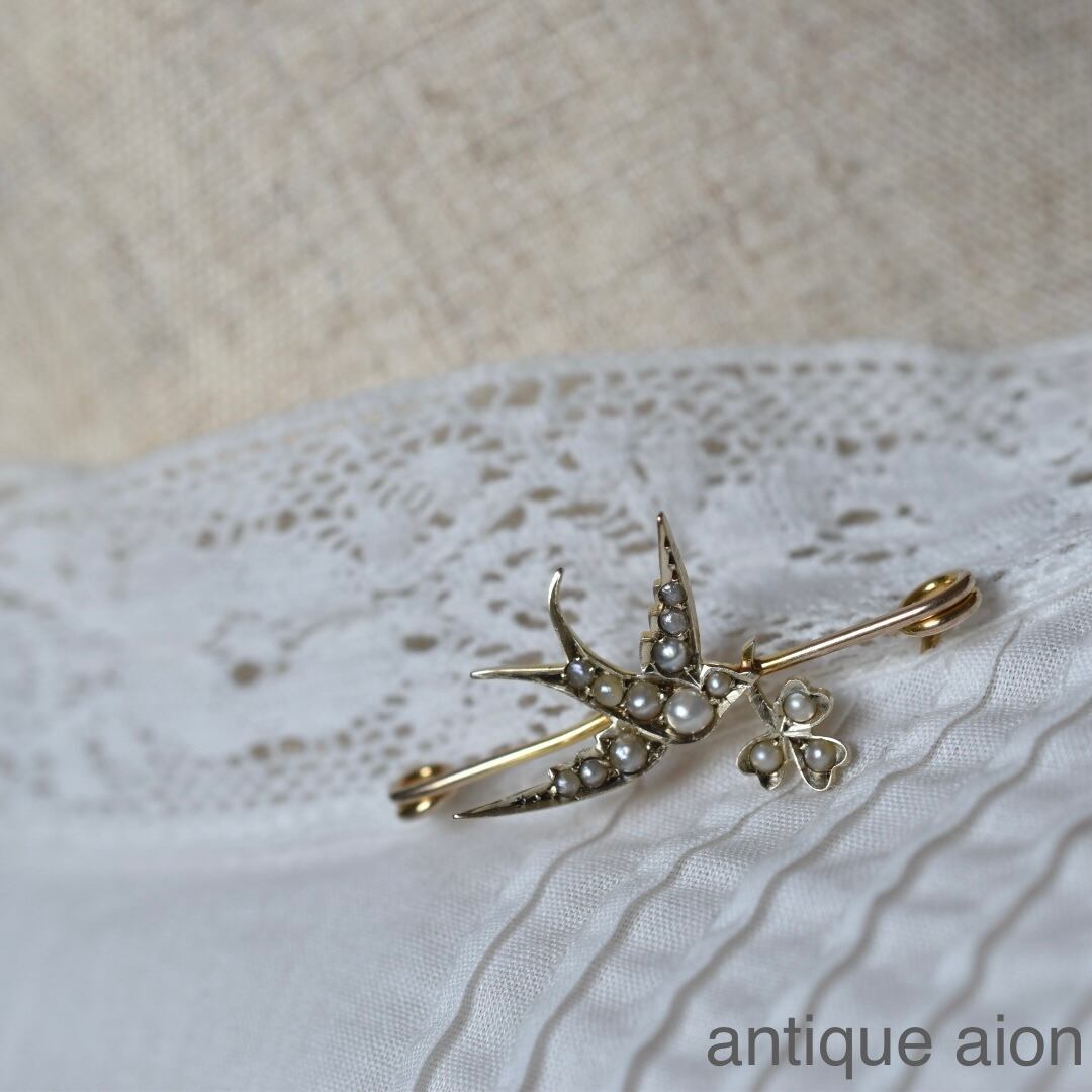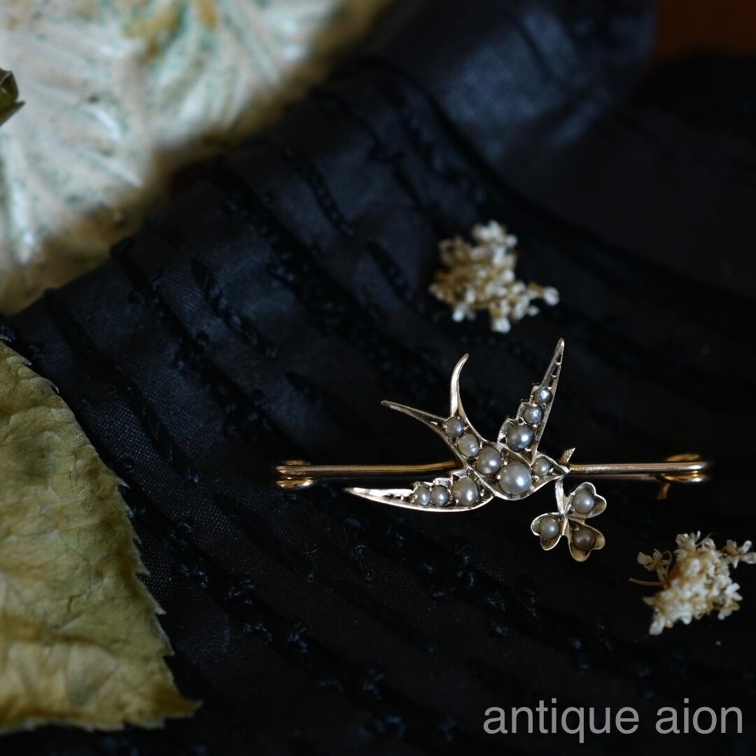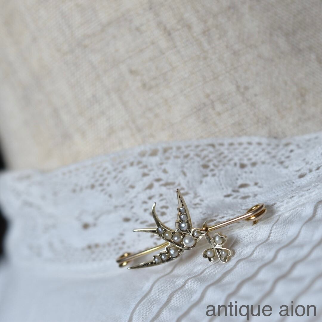 英国アンティーク1910年 エドワーディアン K9 シードパール つばめとクローバーのブローチ MB & Co