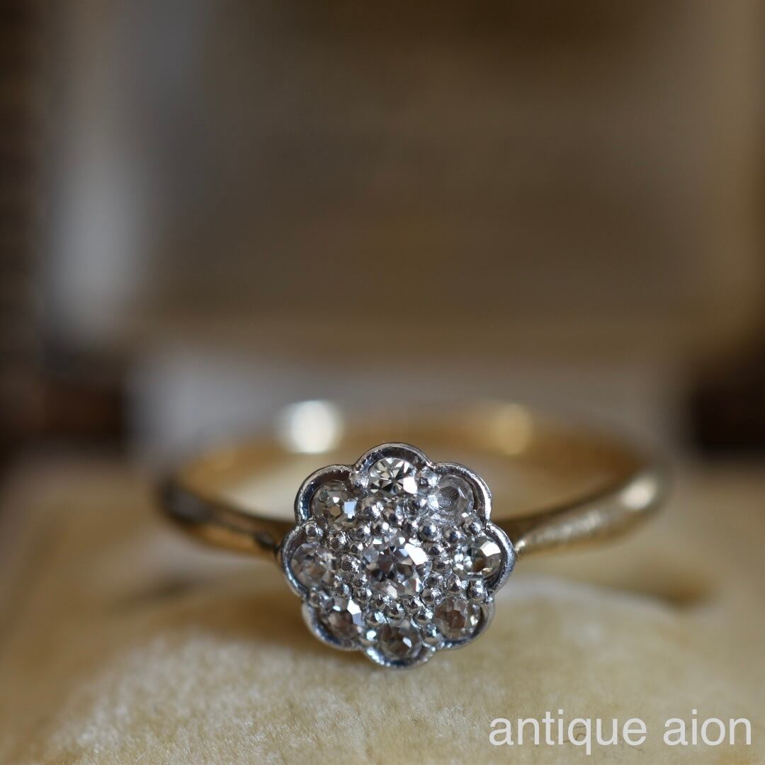 英国アンティーク 20世紀初頭 アールデコ 18金 プラチナ 天然ダイヤモンドのデイジーリング 10.5号