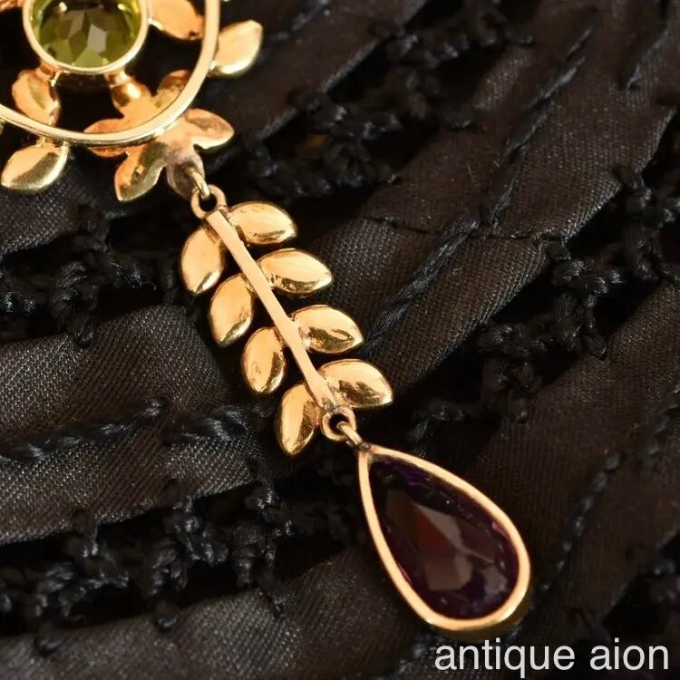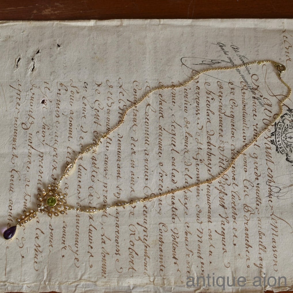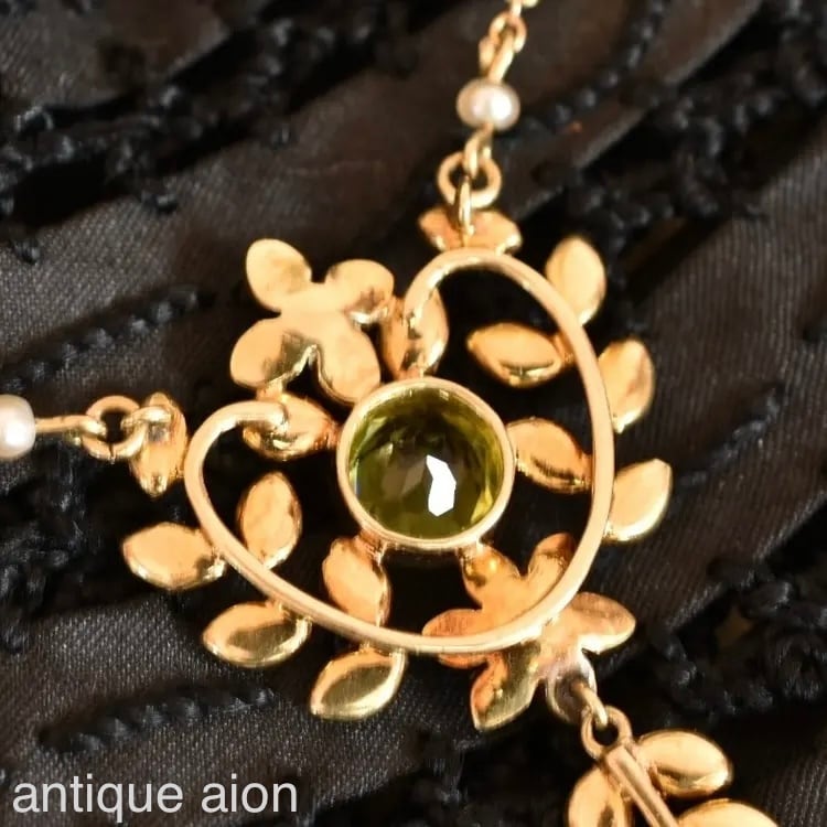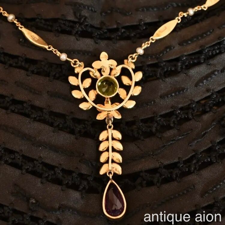 英国アンティーク 1890年 ヴィクトリアン K15 天然ペリドット、アメジスト、パールの豪華ネックレス