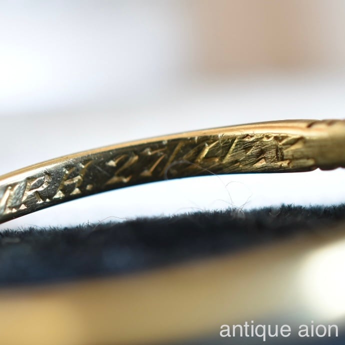 刻印にJ.B・M.R.H 27/4/32とあることから、二人分のイニシャルJ.BとM.R.H(アルファベットが3つあるのはミドルネームを含む)、1932年4月27日のエンゲージメントリングであることが伺えます。