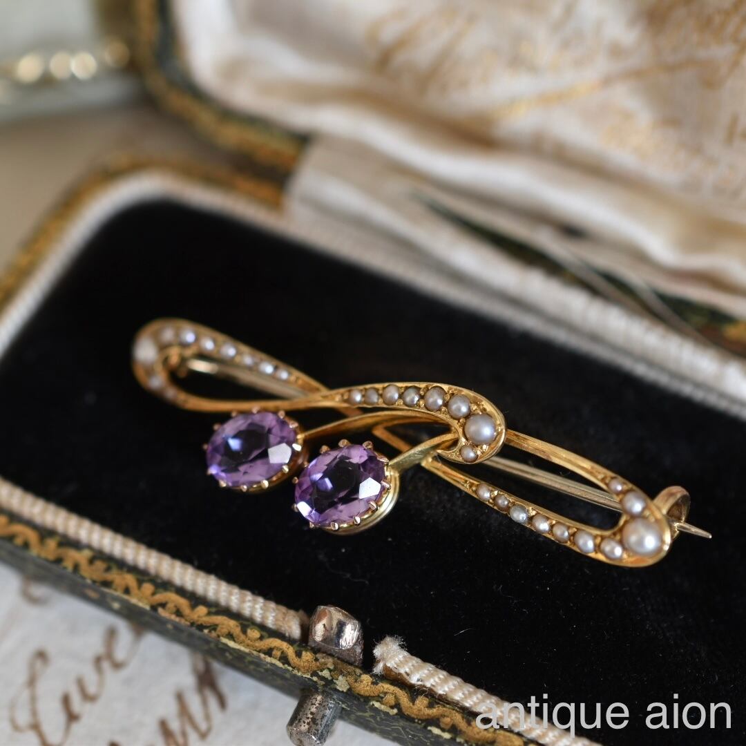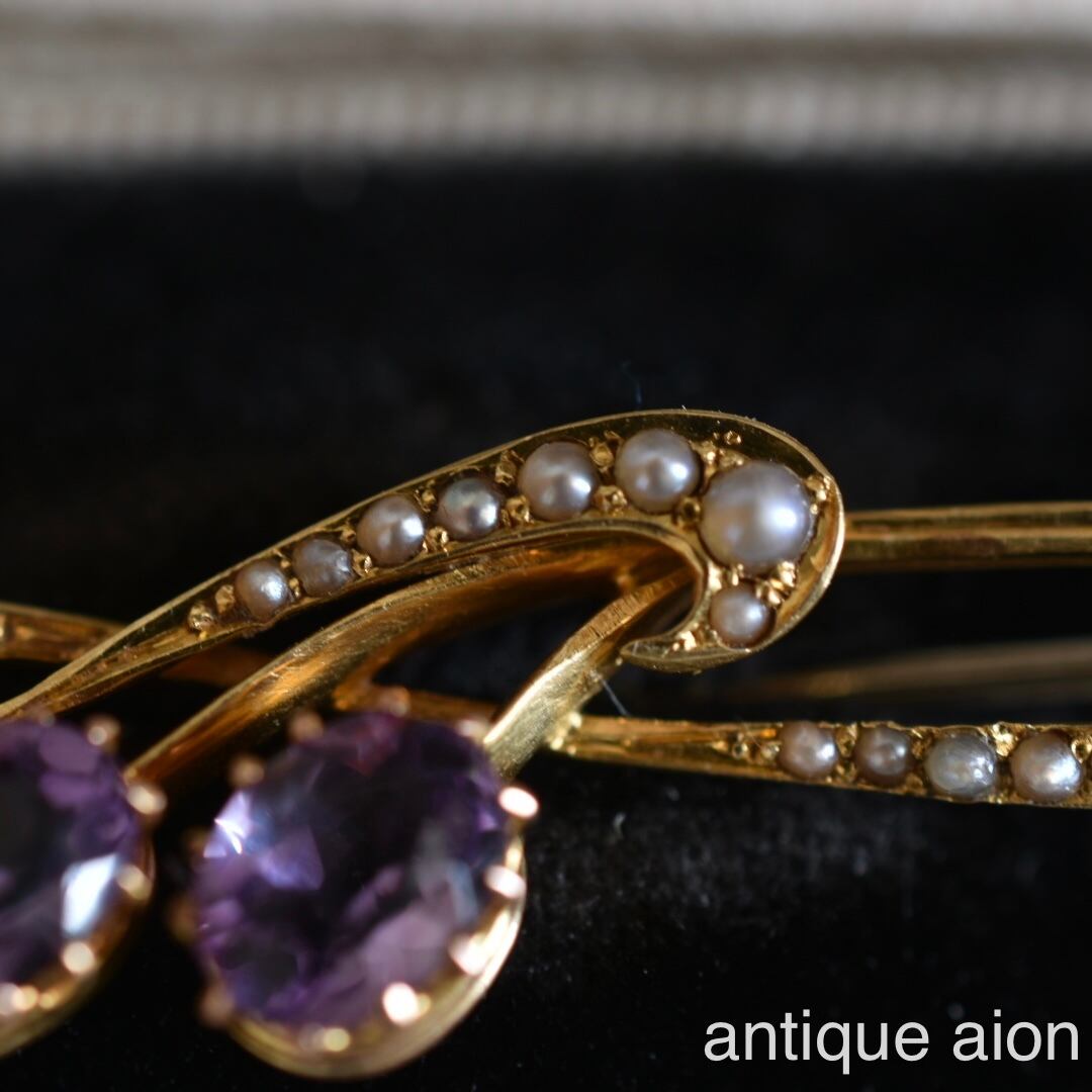 英国アンティーク 20世紀初期頃 アールヌーボー K15 天然アメジストと天然シードパールのブローチ