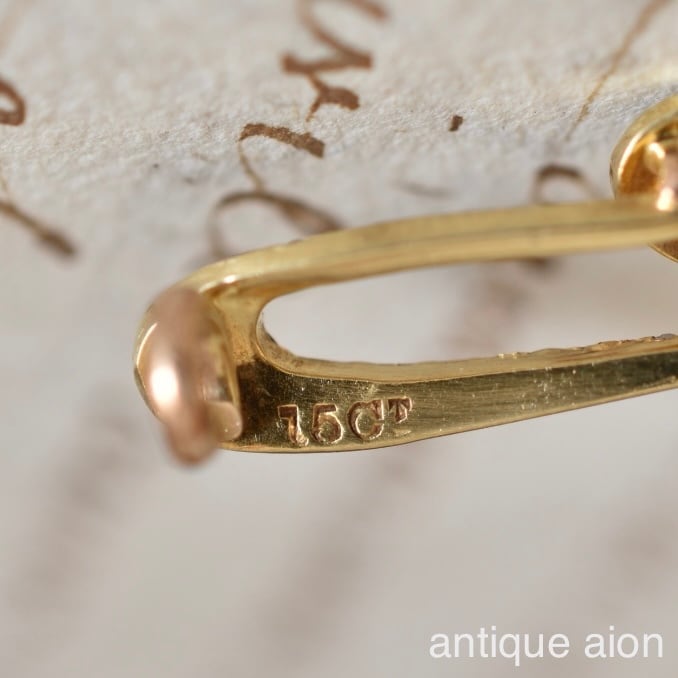 経年により落ち着いた色味の15金の流線上には、深みのある艶やかな天然シードパールが並び、果実のような潤いの天然アメジストが枝垂れているナチュラルなデザイン。