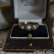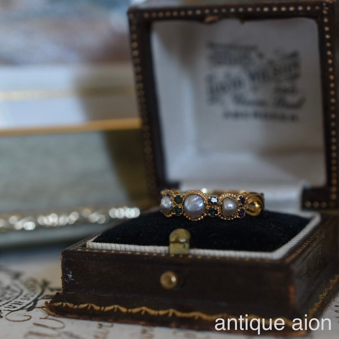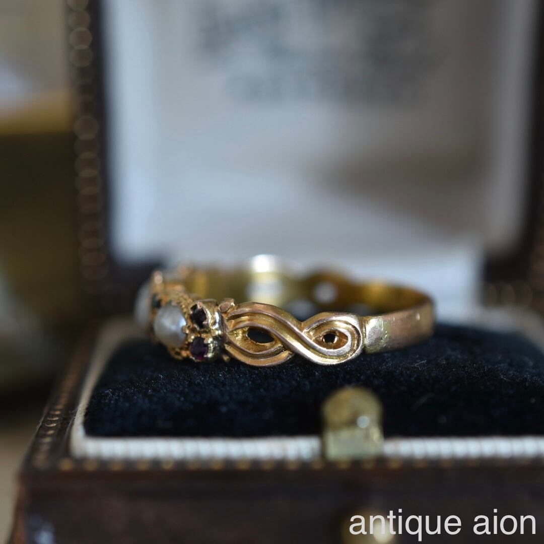 英国アンティーク 1867年頃 ヴィクトリア朝時代 15金 天然パール、天然ルビー、天然ベリルのリング