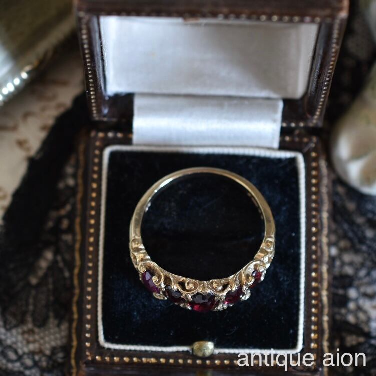 深いワインレッドの魅惑的な煌めきの5石の天然ロードライトガーネット、経年により味わい深い色味のK9ゴールドのオリジナルシャンクには、繊細で美しい彫刻が施され、裏側までぐるりと横縞の模様が入ったクラシカルで素敵なデザインです。