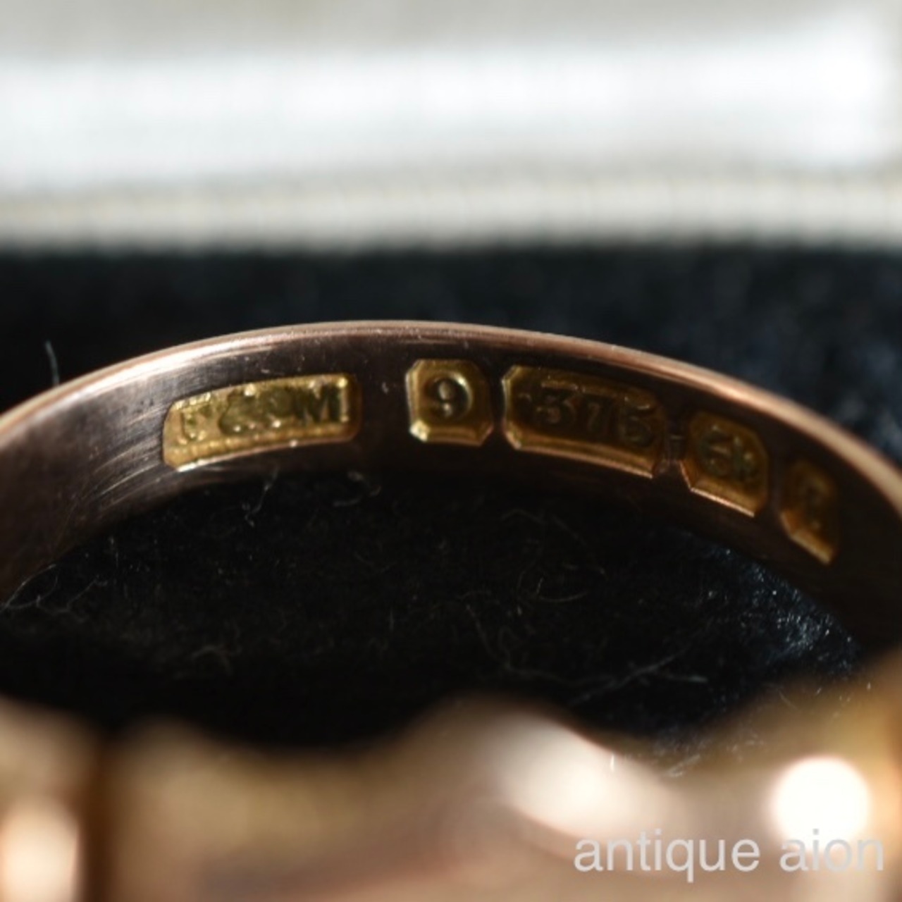 経年により落ち着いた風合いの9ctローズゴールドのシャンクと、盾の縁の見えない箇所までクラシカルな模様の彫刻が丁寧に彫られています。