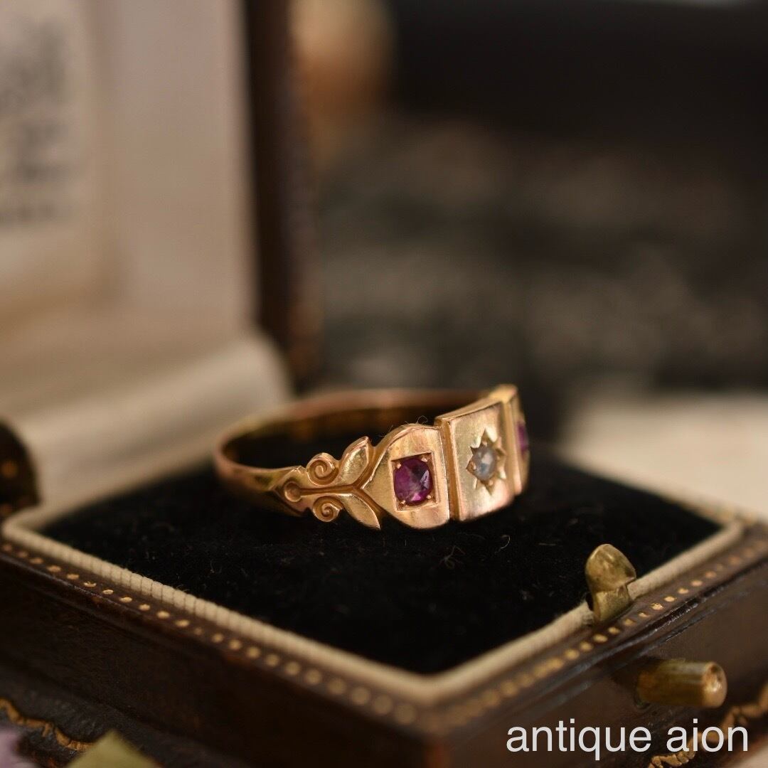 シャンクの地金は15金(刻印あり)、経年により風合い深い色味のシャンクには手彫り模様が施されており、100年以上もの時を経たとは思えないほどの美しい輝きの天然ダイヤモンドを中央に、天然ルビーがその両隣に配されています。