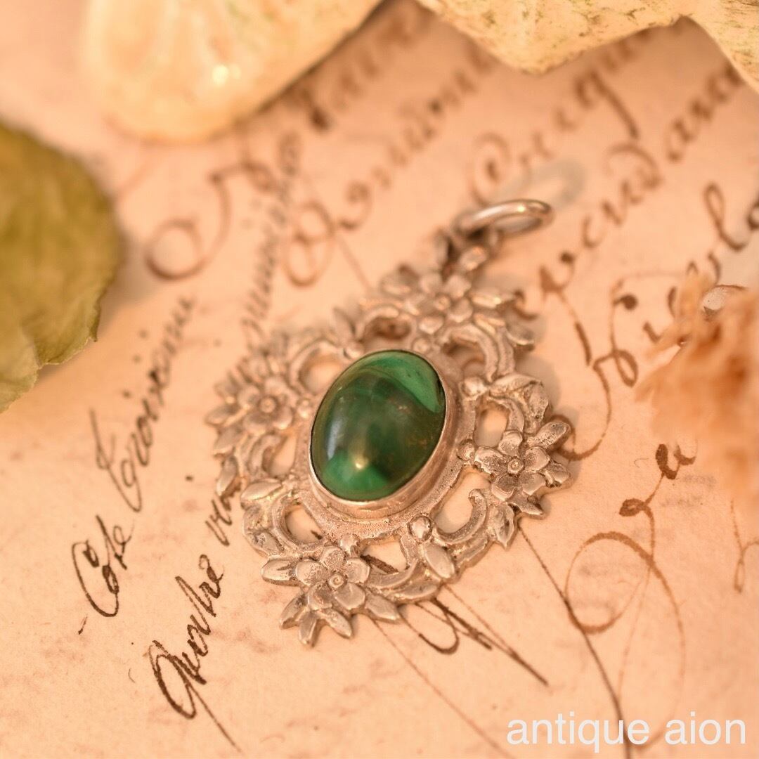 濃淡のあるグリーンカラーの天然マラカイト、カボションカットのコロンとしたフォルムが可愛い天然石の周りを、草花が取り囲むボタニカルなデザインに自然の息づかいが感じられます。