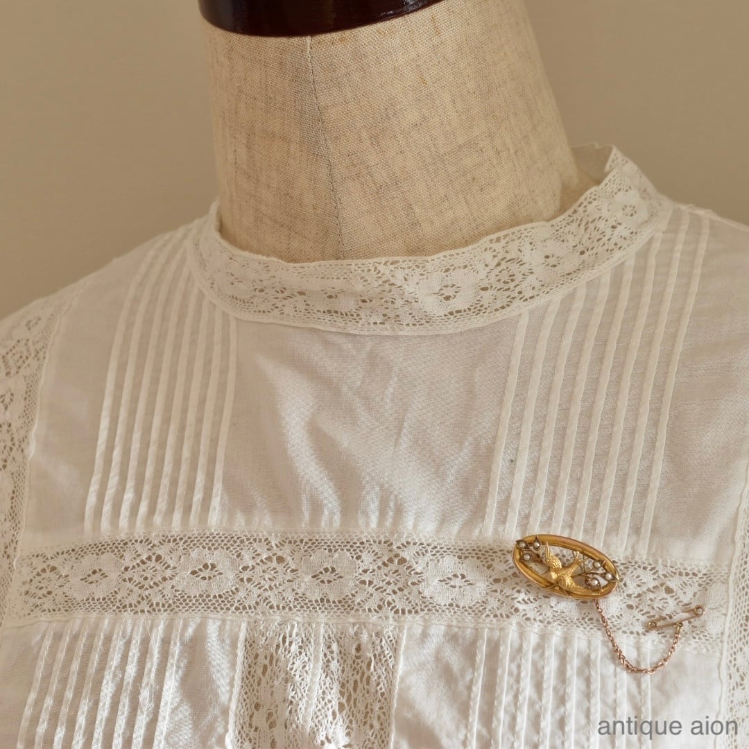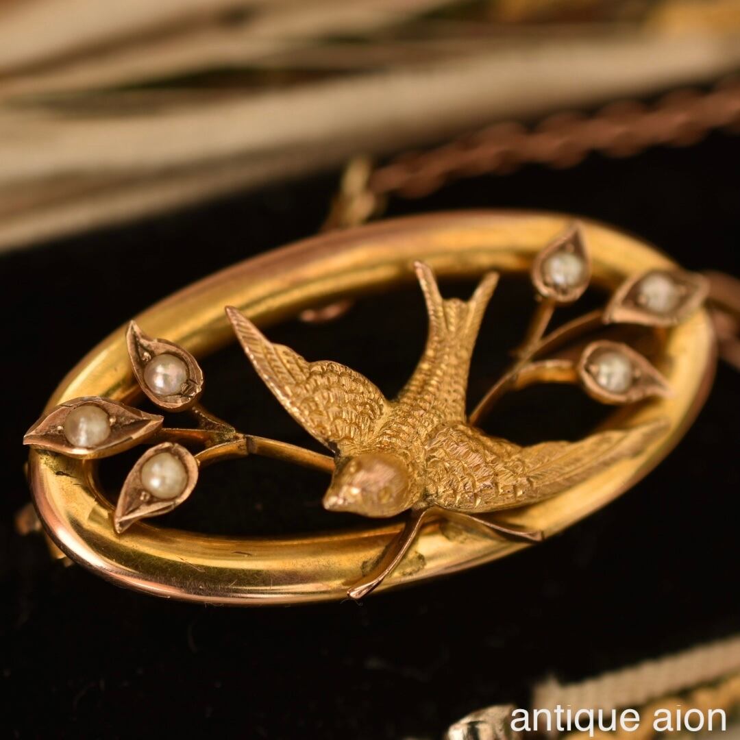 英国アンティーク 19世紀後期頃 9ctゴールド 天然シードパール ツバメのブローチ