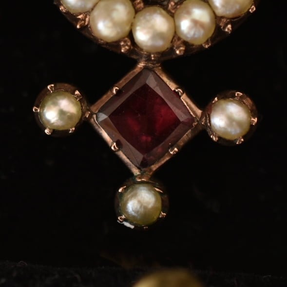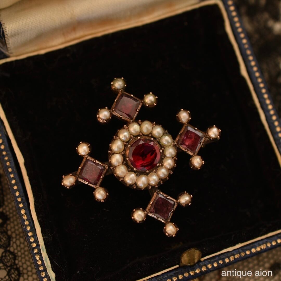 英国アンティーク 19世紀初頭頃 ジョージ王朝時代 9金 天然ガーネットと天然シードパールのブローチ