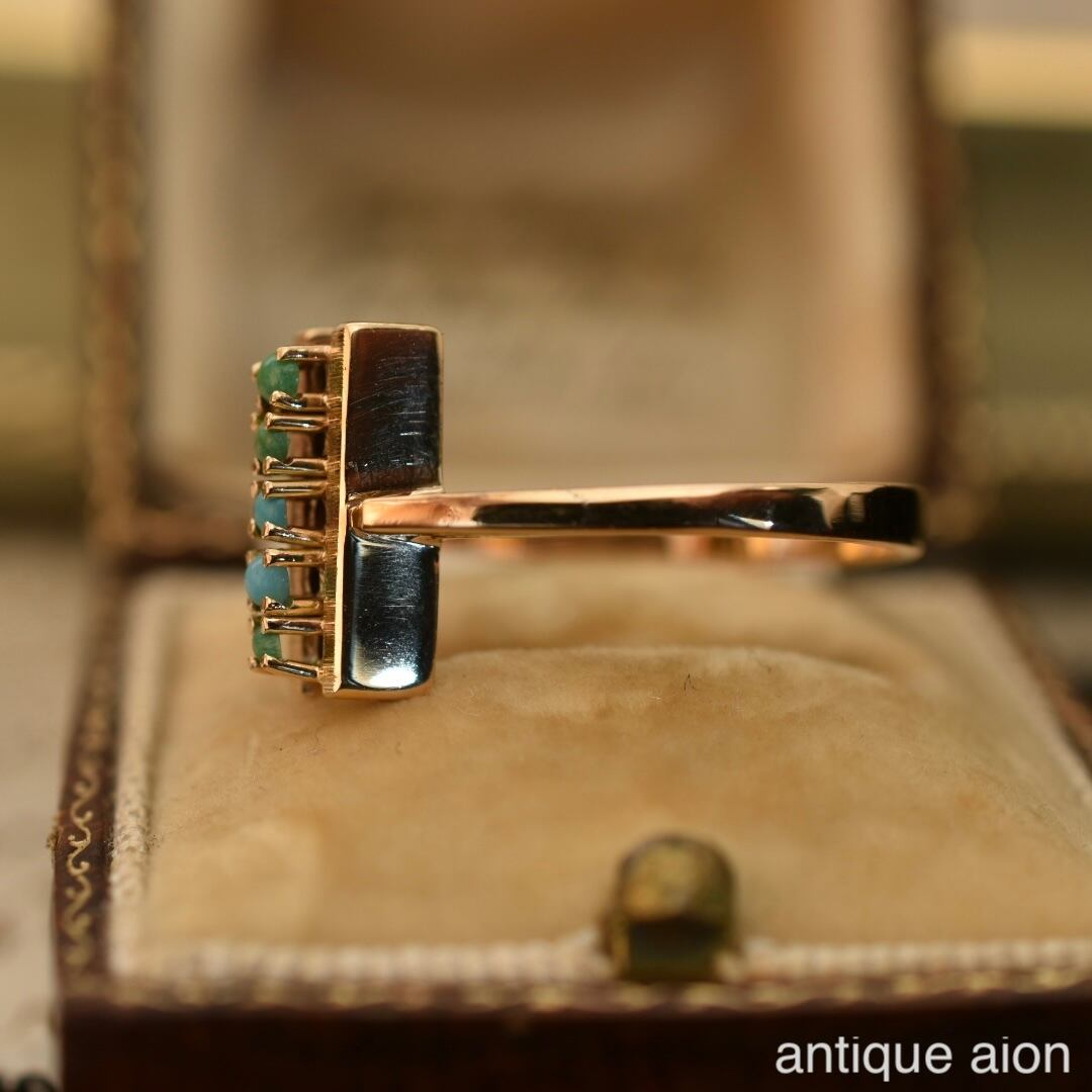 アンティークならではの風合いのグリーンとブルーが混在する上質な天然ターコイズが5石、それぞれ4箇所の爪留めによって掲げるように一列にセッティングされたバーリングになります。