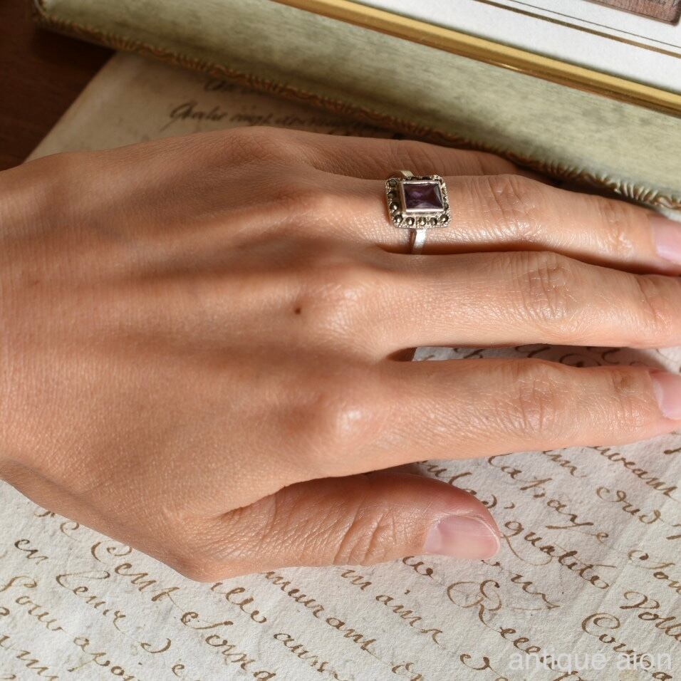 英国ヴィンテージ 1970年代頃 スターリングシルバー 天然マーカサイトとガラスのリング