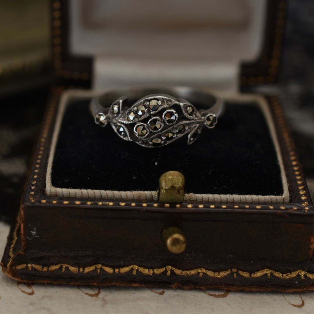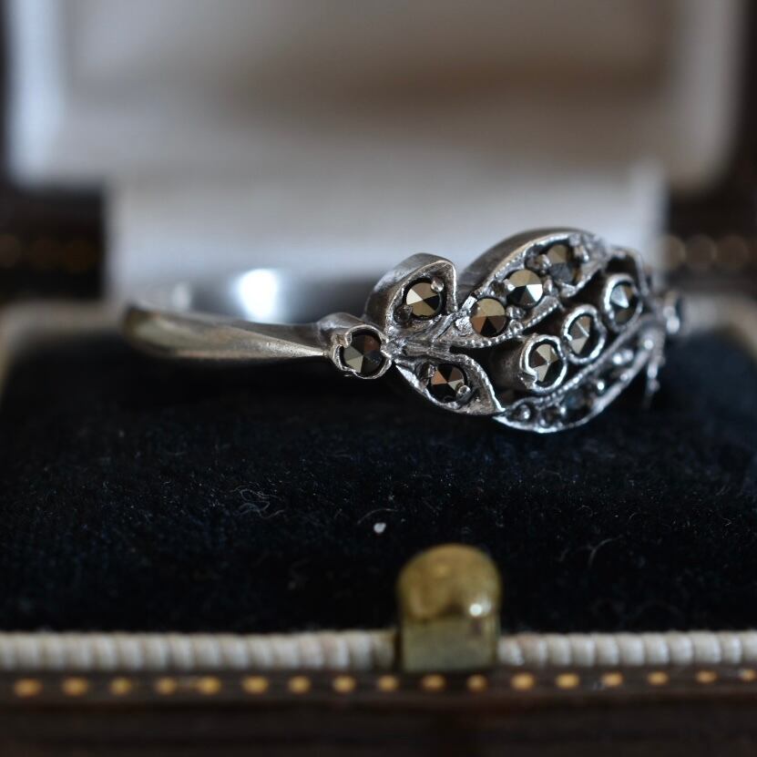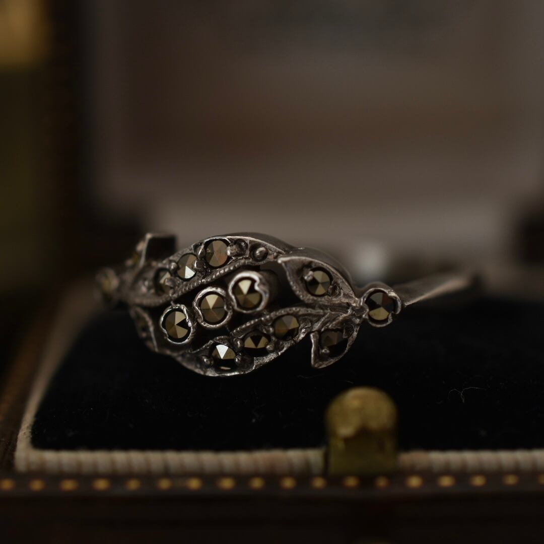 英国ヴィンテージ 天然マーカサイトとスターリングシルバーのリーフリング