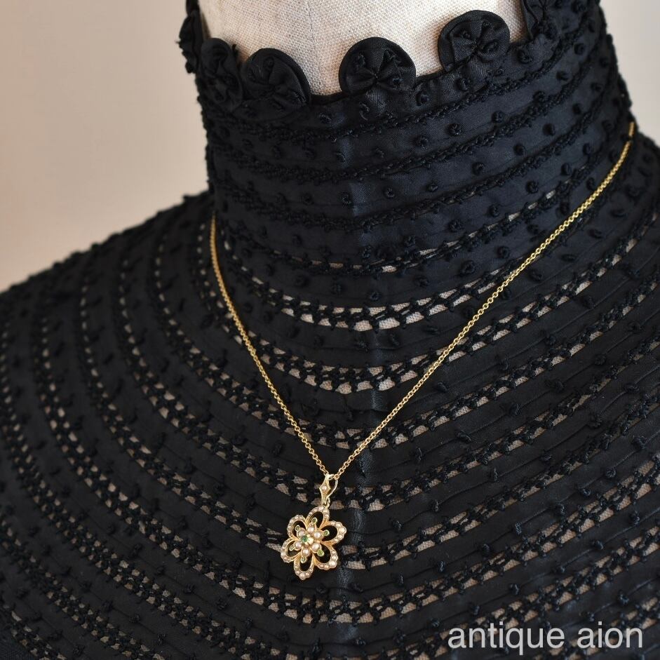 鮮やかなグリーンの天然デマントイドガーネットと天然シードパールで彩られた可愛いお花がモチーフのデザイン。